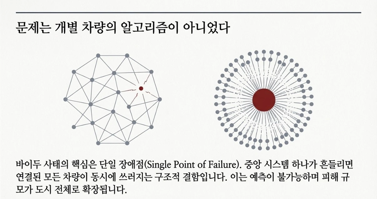 이 사건의 핵심은 차량 한 대의 알고리즘 오류가 아닙니다. 중앙 시스템 하나가 흔들렸을 때, 연결된 모든 차량이 동시에 쓰러지는 구조가 문제입니다. 이른바 ’단일 장애점(Single Point of Failure)’입니다. 개별 차량의 결함보다 훨씬 무서운 이유는 예측이 불가능하고, 규모가 도시 전체로 확장되기 때문입니다.
