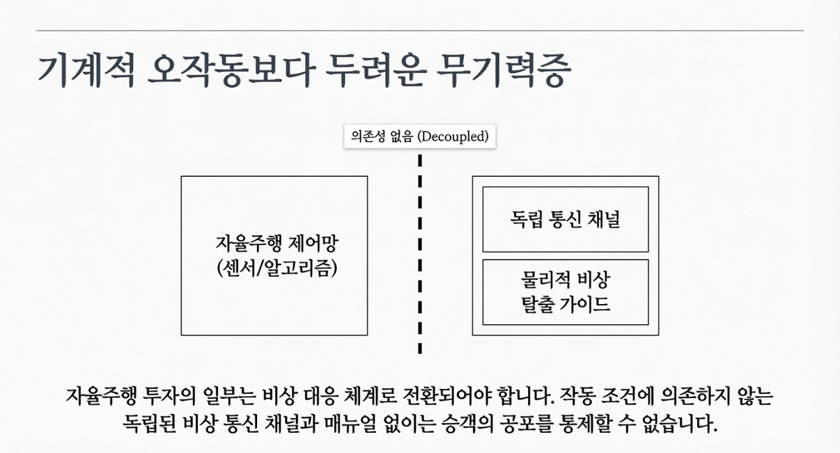 사람이 기계의 오작동보다 더 두려워하는 것이 있습니다. 위기 상황에서 아무것도 할 수 없다는 고립감입니다. 자율주행 기업들이 센서와 알고리즘에 쏟는 투자의 일부를, 사고 발생 시 승객과 연결되는 비상 대응 체계에 써야 한다는 것을 이번 사건은 증명합니다. 차량 시스템과 완전히 독립된 통신 채널, 작동 조건에 의존하지 않는 물리적 비상 탈출 안내가 필요합니다.