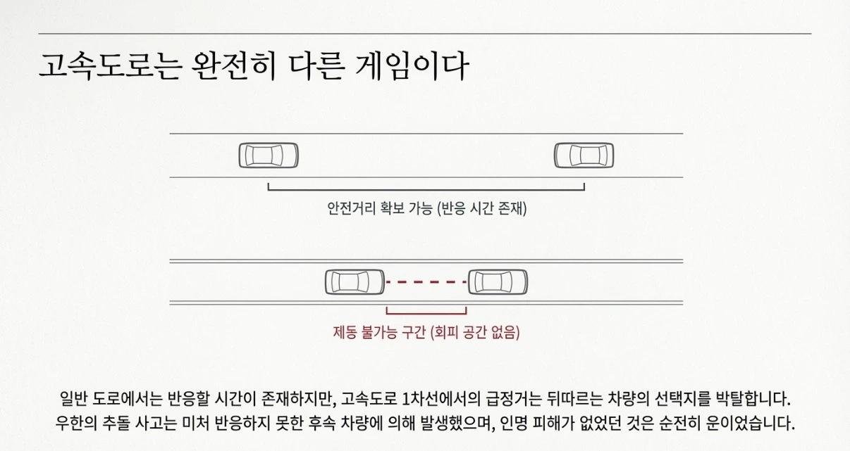 일반 시가지에서 차가 갑자기 멈추면 후속 차량에게 반응할 시간이 있습니다. 고속도로 1차선에서 차가 갑자기 멈추면 뒤따르는 차량은 선택지가 없습니다. 이번 사고에서 한 운전자는 앞차가 피하려고 급차선 변경을 하는 바람에 미처 반응하지 못하고 추돌했다고 전했습니다. 인명 피해가 없었던 것은 순전히 운이었습니다.