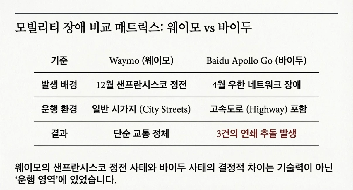 웨이모 사태에서는 대형 충돌 사고가 없었습니다. 바이두 사태에서는 세 건의 충돌이 발생했습니다. 이 차이는 기술력의 차이가 아닙니다. 운행 영역의 차이입니다.