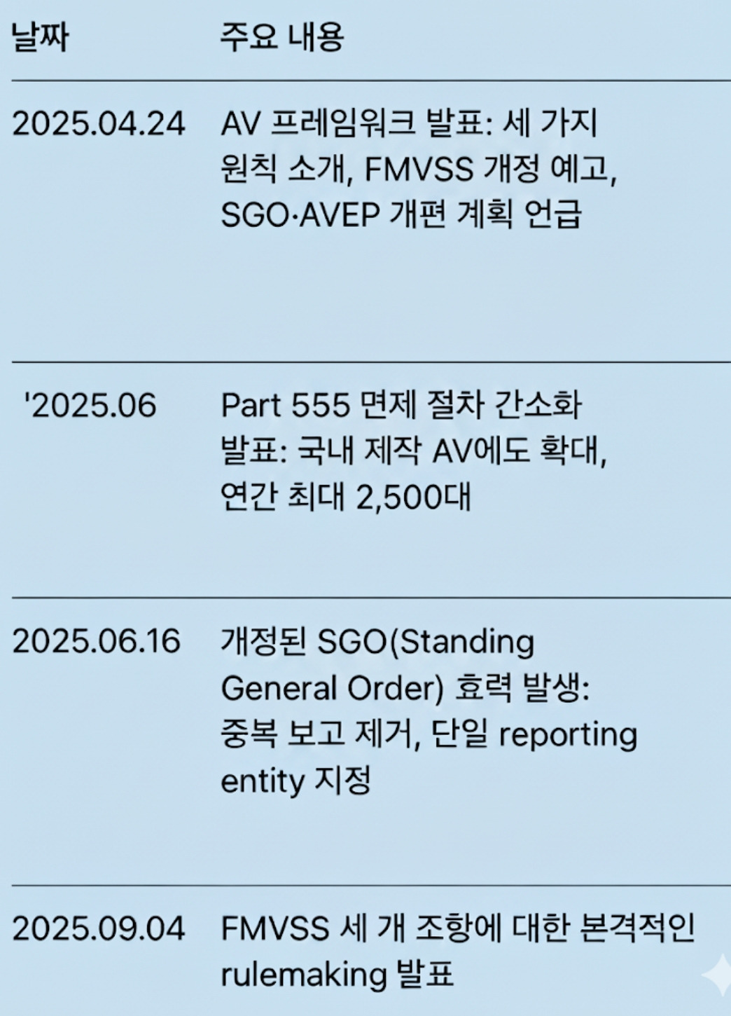 2025년 6월, NHTSA는 ‘Part 555 면제 프로그램(AVEP, Automated Vehicle Exemption Program)’을 외국산 차량뿐 아니라 미국 내 제작 차량으로도 확대하고, 연간 최대 2,500대까지 FMVSS를 완전히 준수하지 않아도 운행 혹은 상업적 판매를 허용하는 프로세스를 대폭 간소화했습니다. 이 획기적인 변화는 AV 제작사들이 더욱 빠르고 유연하게 차량을 테스트하고 시장에 출시할 수 있도록 지원합니다.