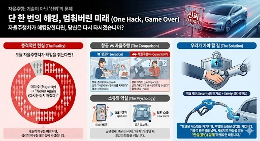 자율주행 산업의 성패는 "해킹을 100% 막을 수 있는가"보다 "해킹 가능성에도 불구하고 대중이 안심하고 탈 수 있는 심리적/제도적 안전장치가 마련되어 있는가"에 달려 있다고 볼 수 있습니다.