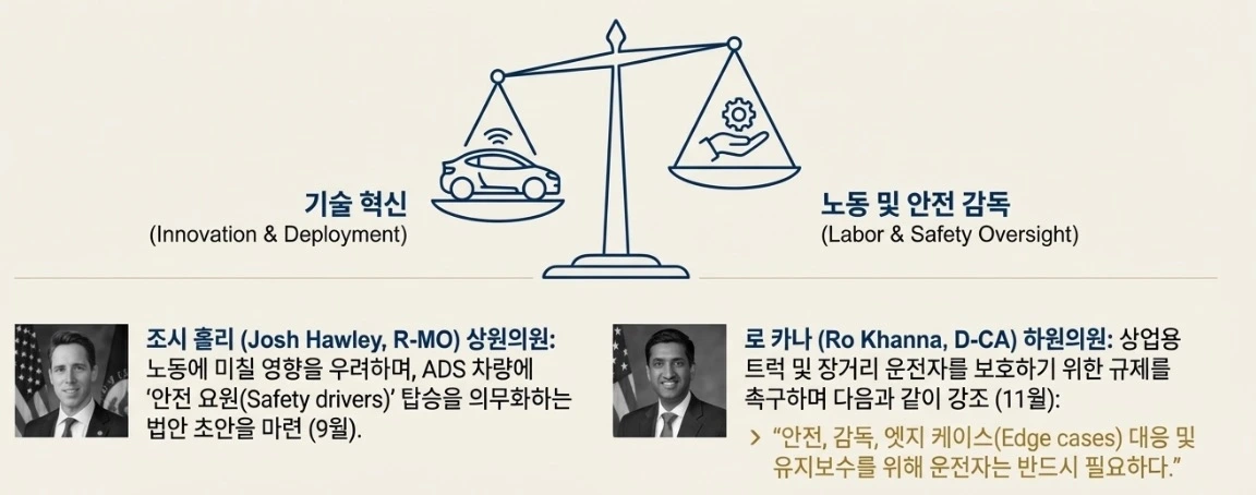 보고서에서 가장 눈에 띄는 갈등은 '노동(Labor)' 이슈였습니다. 트럭 노조와 일부 의원들은 "안전과 돌발 상황 대응을 위해 인간 운전자가 필요하다"라고 주장했고, 업계는 완전 무인화를 외쳤습니다. 2026년에는 이 갈등이 더욱 심화될 것으로 보입니다.