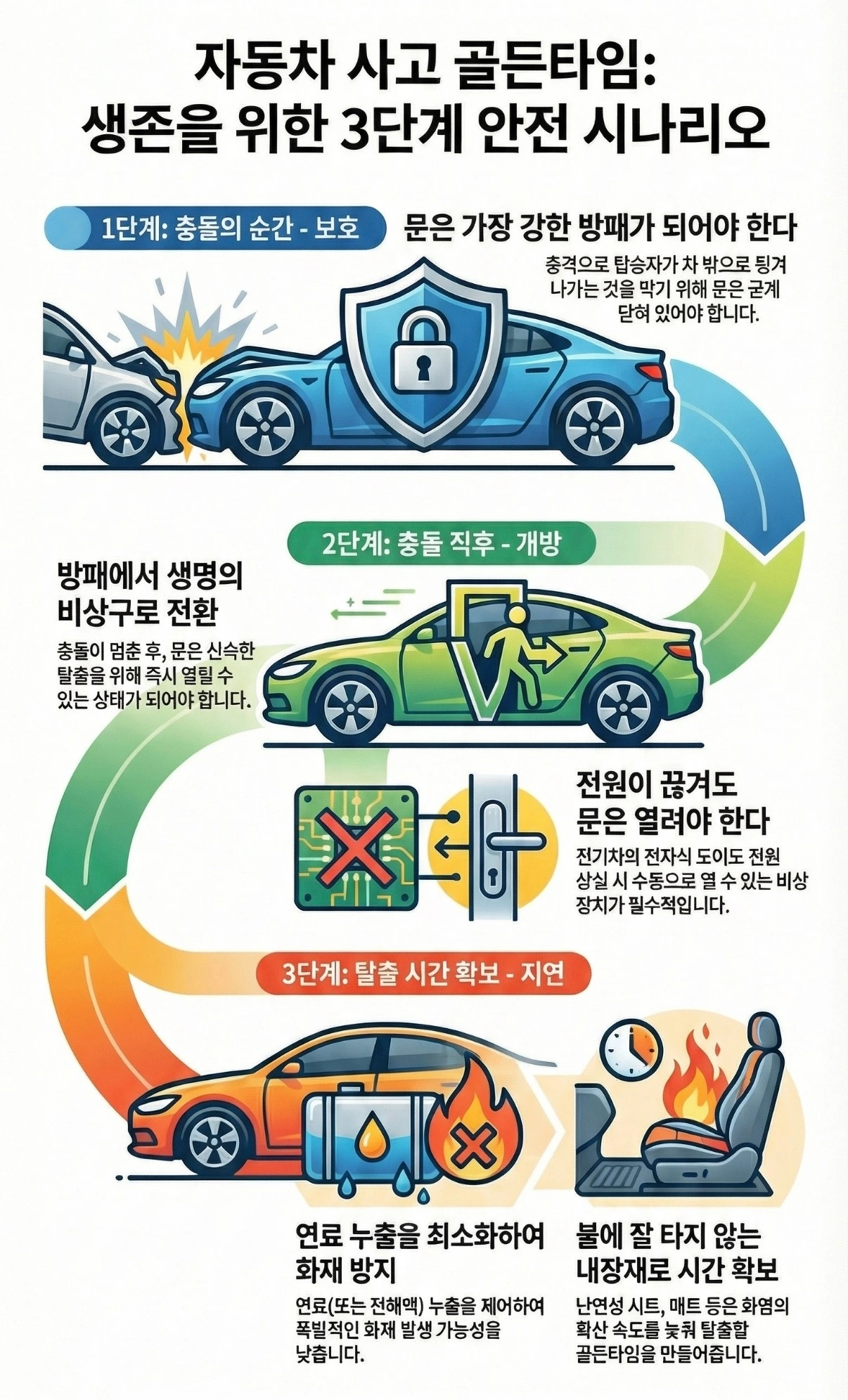 #자동차안전 #전기차도어 #비상탈출 #난연성 #연료누출 #골든타임 #플러시핸들 #안전규제 #교통사고생존