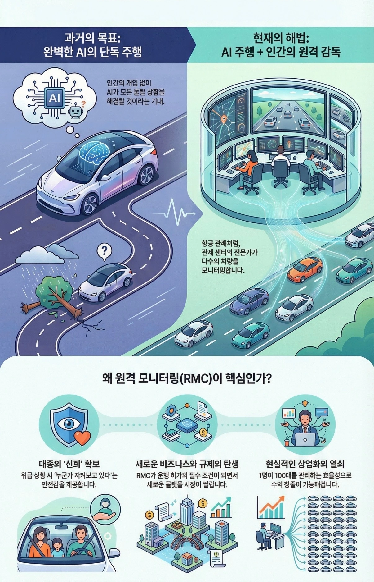 결국 대중이 자율주행차를 마음 놓고 타기 위해 필요한 마지막 퍼즐 조각은 "누군가 지켜보고 있다"는 안전감입니다. RMC 기술은 바로 이 지점을 파고듭니다.