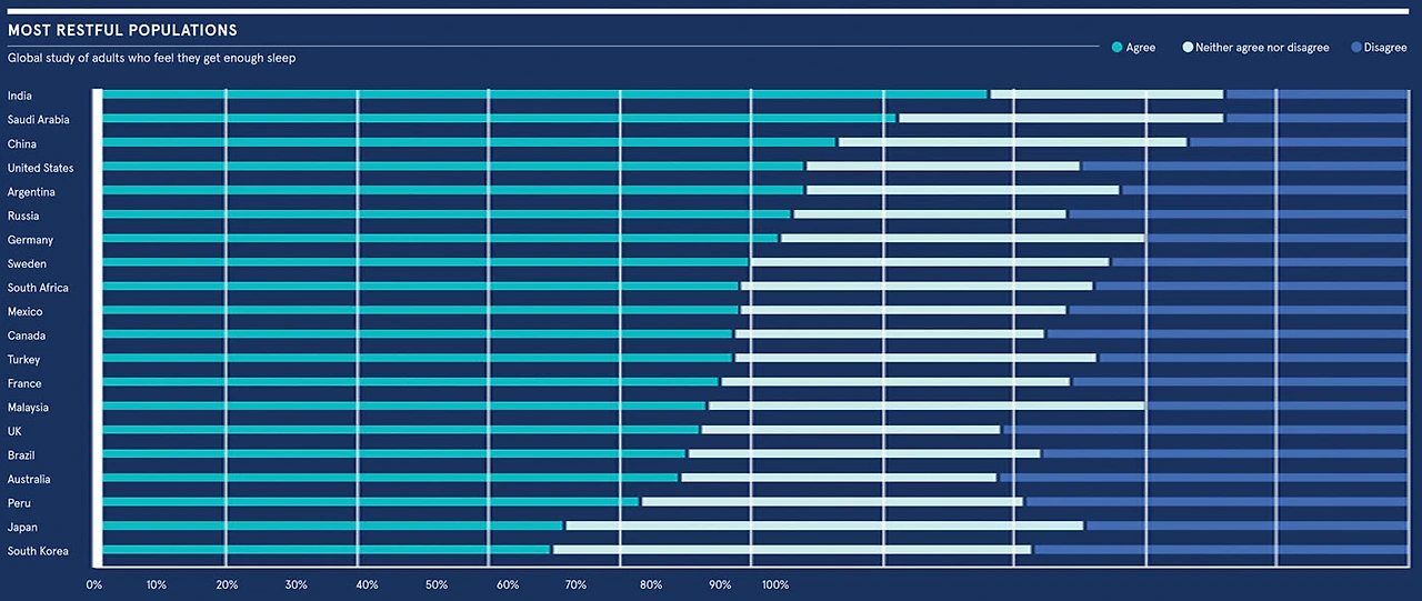 다른 기관의 조사 결과도 한국이 '잠 부족 국가'임을 뒷받침한다. 글로벌 리서치 기업 '입소스'가 2018년 세계 20개국을 대상으로 수면 시간을 조사한 결과, '잠을 충분히 자는가'라는 설문에 한국이 가장 낮은 비율로 '그렇다'고 대답했기 때문이다.