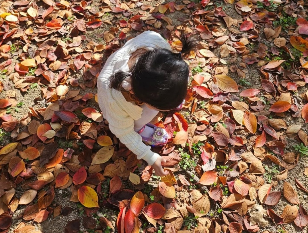 둘째는 유모차 안에서 조용히 잠들어 있었고, 첫째는 곱게 물든 낙엽을 가리키며 웃었다.