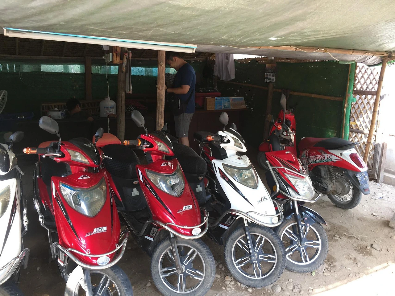 약간 쫄보인 탓에 오토바이 및 스쿠터 류의 탈 것을 타본 적이 없는데, 여기서 처음으로 타봤다. 동행인, 그리고 아래 사진에서 남색 옷을 입고 스쿠터를 빌리고 있는 H에 따르면, 미얀마의 거의 모든 스쿠터는 e바이크라고 한다. 중간의 발달과정이 많이 생략되어 있어서 전기로 된 탈 것이 꽤나 보급되었다고 했다. 모바일 인터넷 역시도 3G의 보급에서 4G의 전환 (우리나라처럼)이 아닌 4G 망이 바로 깔려서 모바일 인터넷이 꽤나 빠른 상태였는데, 비슷한 맥락이라고 할 수 있겠다.