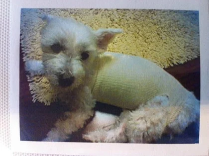 이 사진은 모모가 12살 때 유선종양 수술 후 붕대옷을 입고 퇴원한 모습입니다. 젊어서는 하얗다 못해 투명한 눈부신 긴 털을 가졌었지만 나이 지긋해선 털발이 전 같지 않아 늘 짧게 해 드렸어요.