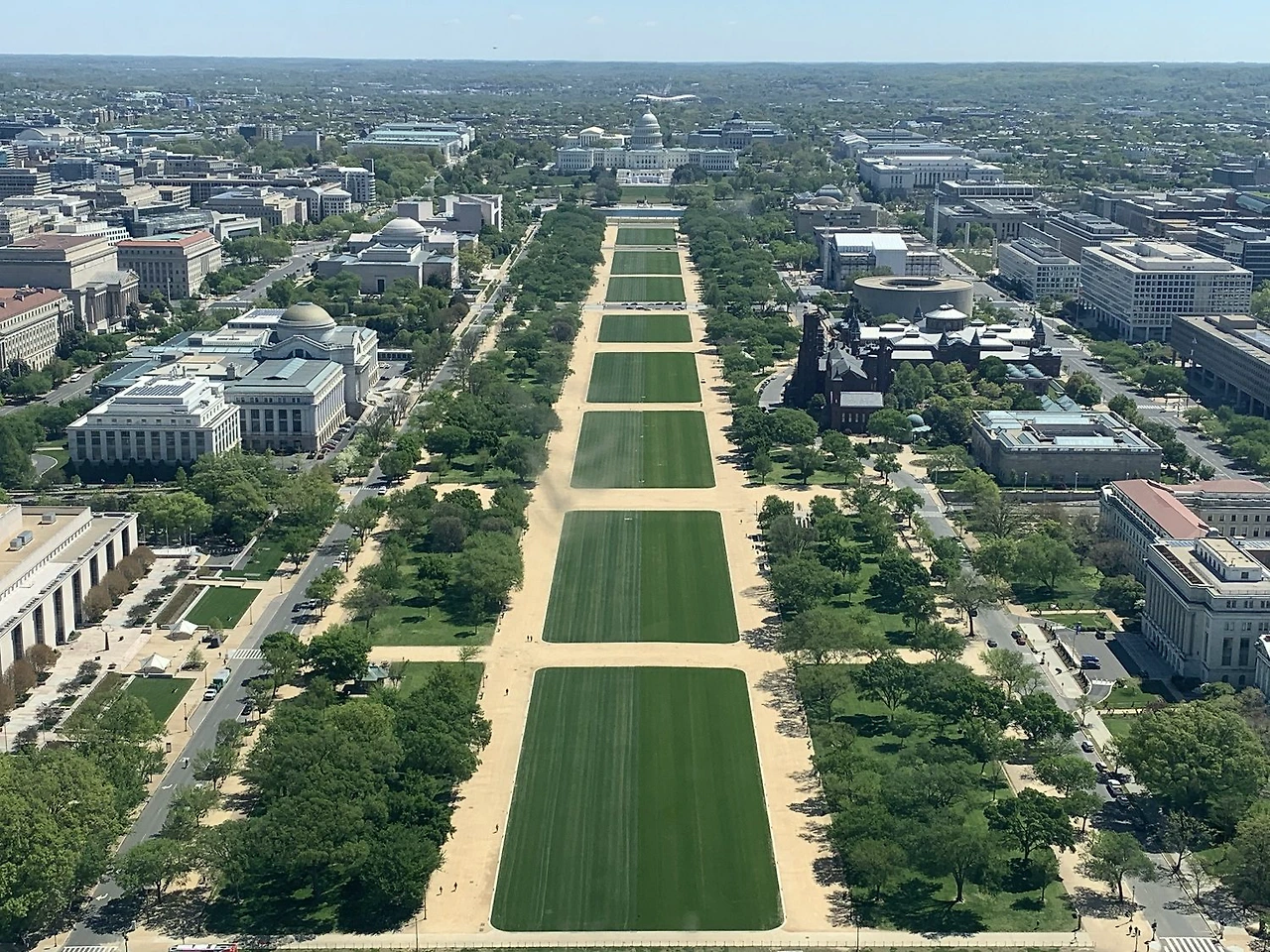 중심에 솟은 워싱턴 기념탑(Washington Monument)은 대표적 랜드마크다. 미국의 수도가 워싱턴으로 시작해 워싱턴으로 끝남을 체감하게 된다. 타워를 자세히 보면 위아래 색이 좀 다르다. 2011년 발생한 지진으로 금이 갔고 3년에 걸쳐 부분적으로 수리됐다. 새 벽돌의 색이 더 밝다. 152미터 꼭대기의 전망대를 가려면 예약이 필요하다. 고속 엘리베이터로 올라가 모든 방향에서 시내를 조망할 수 있다.