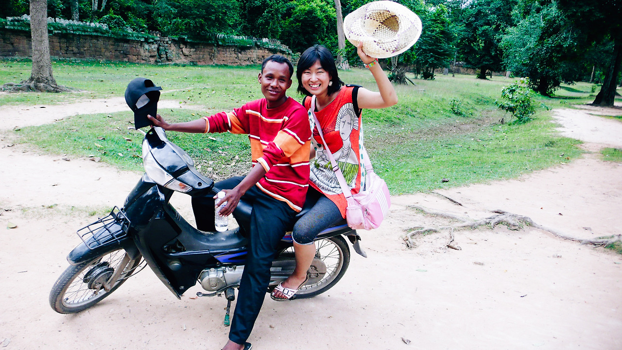 다음날 재키는 말끔히 차려 입고 호텔 앞에서 기다리고 있었다. 그런데 툭툭이 바퀴 고장으로 어쩔 수 없이 오토바이 뒤에 매달려 다니기 시작했다. 앙코르 유적지는 사원 수만 37개에 달하는 넓은 곳이라 관광하는 시간만큼이나 초원을 달리는 시간이 길었다. 오토바이를 타고 팜트리 길을 쌩 달리면 바다처럼 깊은 하늘 속으로 풍덩 빠져버리는 것 같았다.