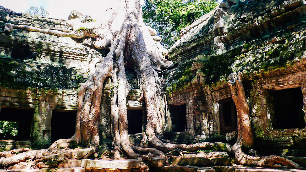 앙코르를 떠나는 날 마지막으로 들린 사원은 안젤리나 졸리의 영화 <툼레이더>로 유명해진 '따프롬'이었다. 저 멀리 보이는 지붕 위로 무서운 발톱 하나가 스윽 내밀고 있는 것이 입구에서부터 심상찮았다. 안으로 들어서니 커다란 팜트리가 사원의 지붕에서 죽 흘러내리고 있었다. 금방이라도 무너질 것 같았다.