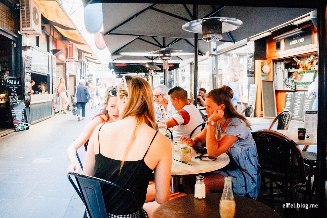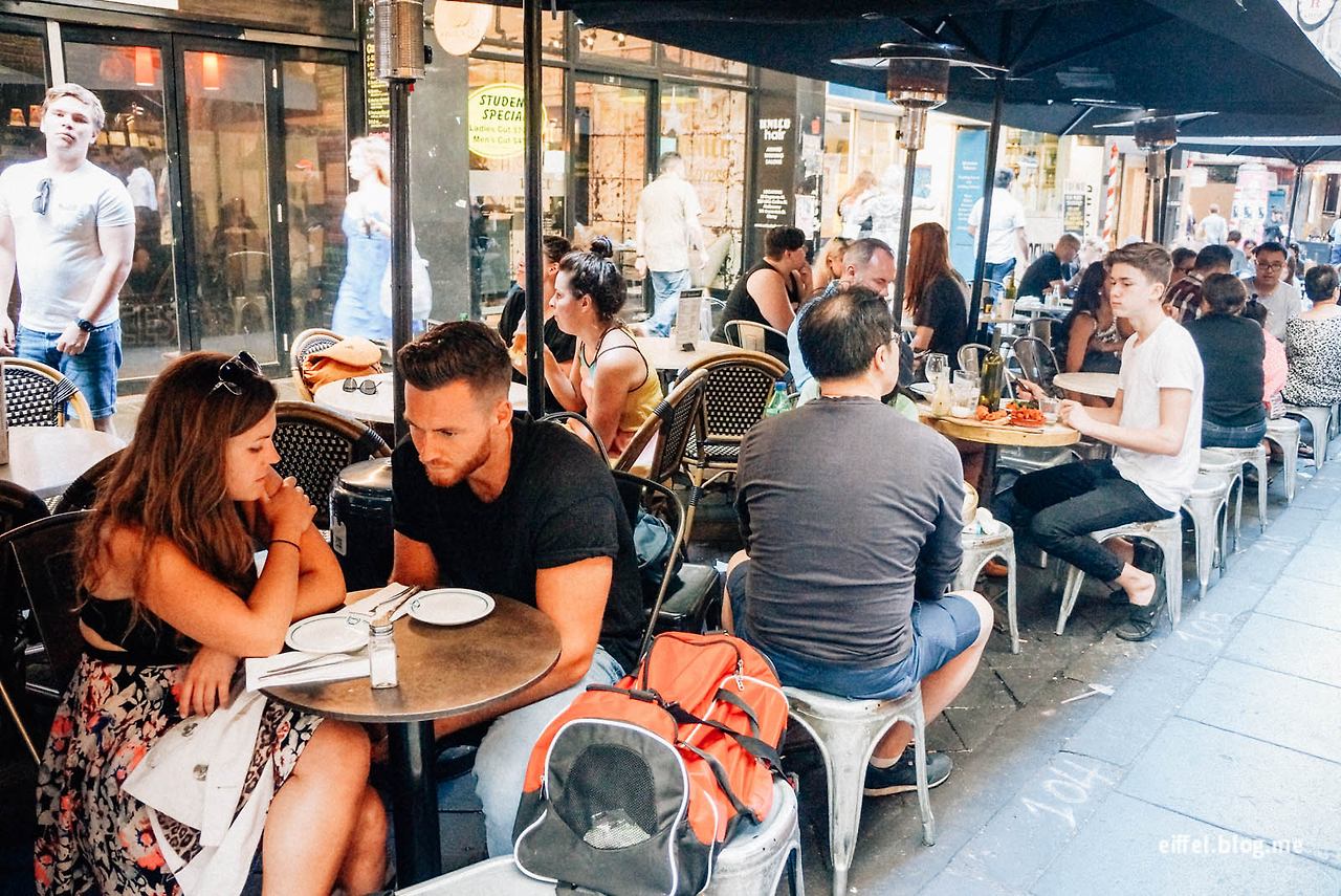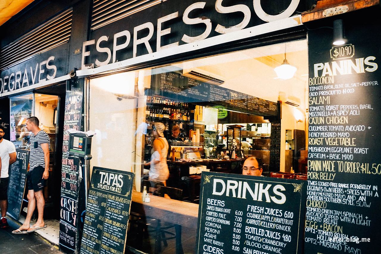 멜버른에서 카페 거리를 빼놓을 순 없다. ‘디그레이브 에스프레소 바Degraves Espresso Bar’는 카페 거리 중간쯤 있는 곳으로 이곳 커피는 진하고 깊은 맛을 자랑한다. 내부 인테리어는 상당히 소박한 편. 옛날 영화관의 의자와 법정에서 사용하던 벤치를 가져와 인테리어 한 것으로 유명하다. 커피 외에 맛있는 식사까지 함께 즐길 수 있는데 실내보다는 바깥 카페거리에 세팅된 노천 테이블을 추천한다.