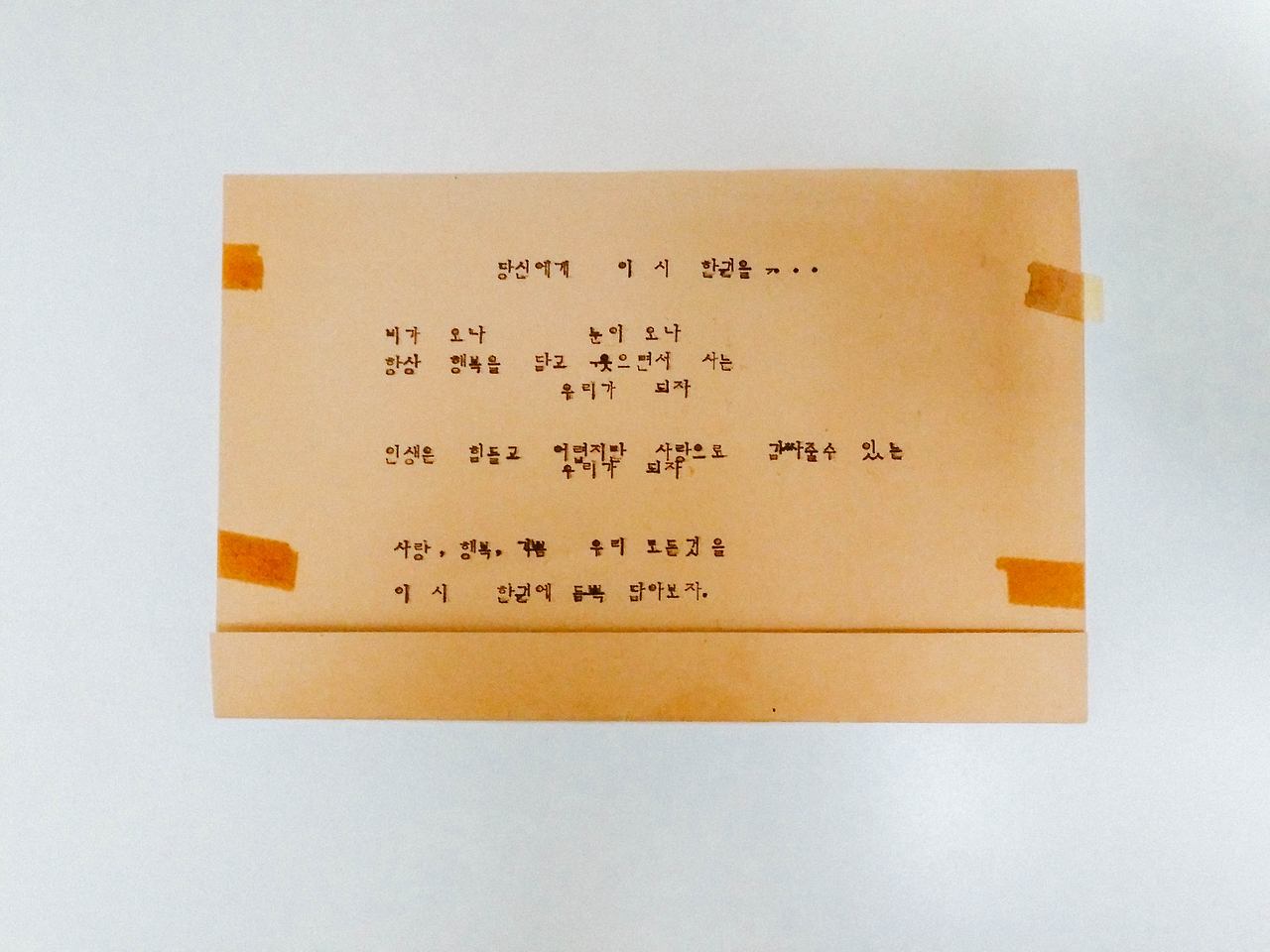 기억보다 빛바랜 갱지 위로 1991년 7월 26일의 타자 소리가 들렸다. ‘우리’가 되길 바라며 시집에 고백을 붙들어 매 두었던 투명 테이프는 악력이 다해 멀건 눈물자국처럼 남았다. 언제부터였을까, 끈기가 다한 접착제 대신 고백 스스로 안간힘을 내어 표지 빈틈에 매달려 있었다.