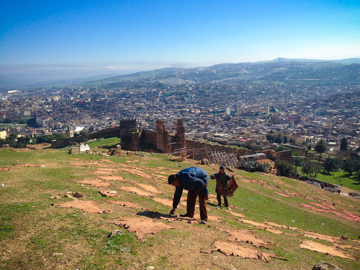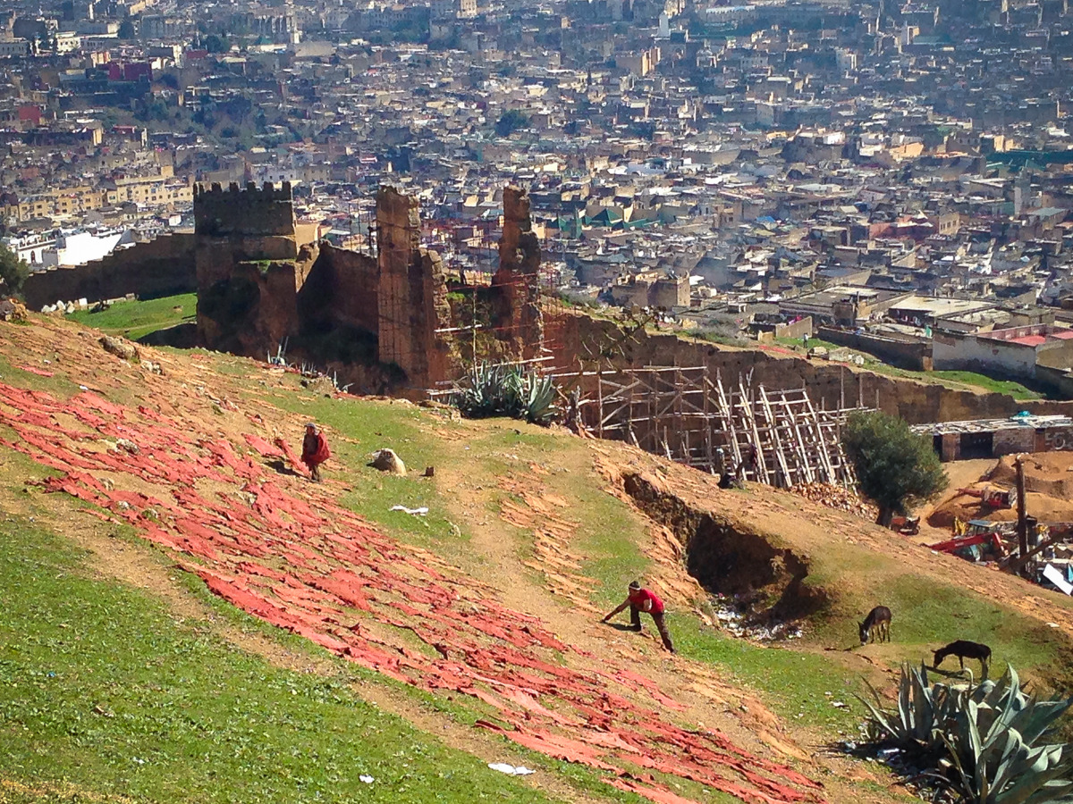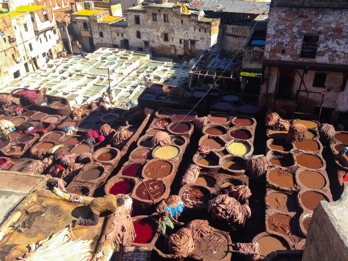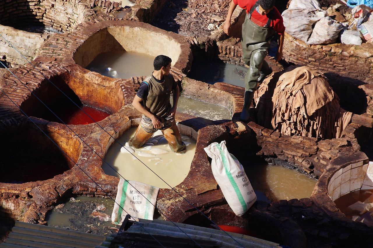 페즈의 가죽은 전 세계에서 최고의 품질로 정평이 나있다. 공정은 크게 무두질과 염색 두 단계로 나뉘는데, 동물의 생피를 석회 수조에 며칠 담가 부드럽게 만든 후 물에 깨끗이 씻어낸다. 그 후 나무껍질, 민트, 인디고, 샤프란 꽃과 같은 천연 염료로 물을 들이는데, 이때 염색이 잘 되도록 비둘기, 염소, 소의 배설물을 섞는다. 천 년이 넘도록 이어온 이 작업 방식은 아버지가 아들에게 아들은 또 그 아들에게 전해주며 가업의 형태로 이어지고 있다. 작업장의 가죽 장인들은 허벅지까지 올라오는 고무장화를 신고 온종일 수조에 몸을 담그고 있다. 가죽도 사람도 알록달록 물들어 있다.