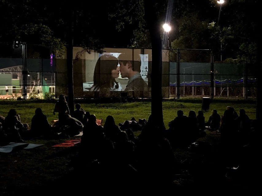 밤이 내려앉자, 사람들은 테니스장 앞으로 옹기종기 모여들었다. 펜스를 스크린 삼아 야외 영화관이 꾸려졌다. 돗자리를 깔고 앉아 무릎 담요를 덮고 과자를 오물거리며 영화에 빠져들어 갔다. 오늘의 영화는 「500일의 썸머」. 썸머와 폴의 달달한 첫키스 장면에선 다들 숨을 죽였다.