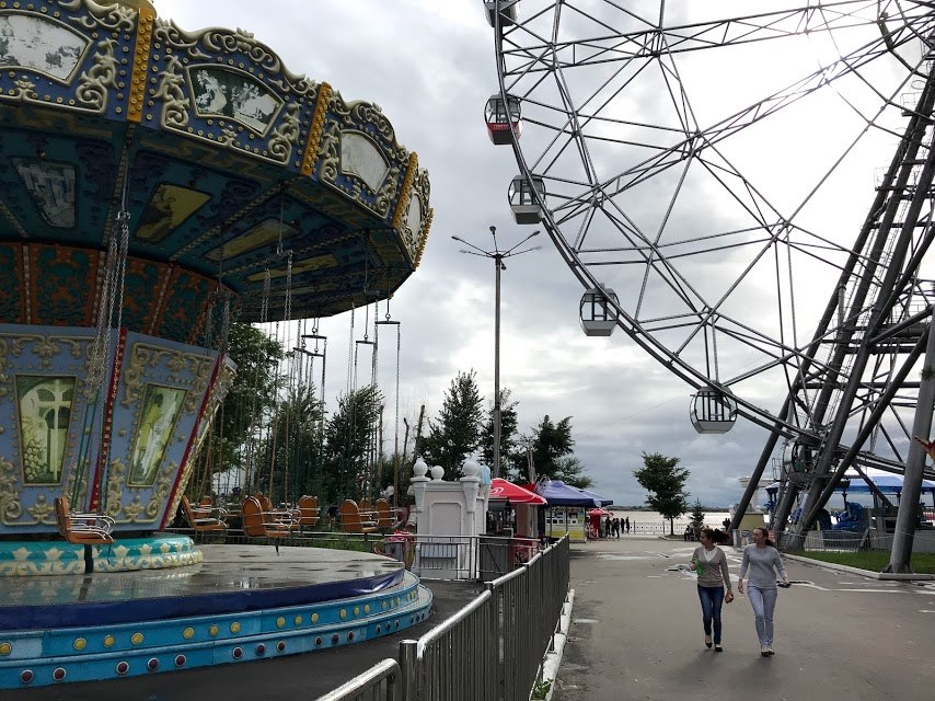 실제로도 아무르 강은 이곳 사람들의 충실한 쉼터였다. 강가에 앉아 낚싯줄을 드리운 채 꾸벅꾸벅 졸고 있는 강태공들, 그네 벤치에 앉아 적당히 발을 구르며 흔들흔들 하는 사람들에게 시간은 느리게 흐르는 것 같았다. 벤치를 그네로 만들 생각은 누가 했을까. 강을 따라 길게 늘어선 공원 안에는 세련되지는 않아도 없는 것이 없었다. 주말에는 이 동네 모든 사람들이 아무르 강의 곁으로 모여드는 듯 했다. 아름드리나무가 넉넉하게 내려뜨린 그늘 아래 누워 노래를 흥얼거리는 사람들, 자전거를 타고 공원을 씽씽 가로지르는 사람들에게 여유로움이 넘쳤다. 월미도만큼이나 촌스러운 놀이기구를 타고 꺅꺅 거리는 사람들을 보며 덩달아 스릴을 느끼다, 천천히 흐르는 대관람차에 올라 아무르 강의 끝이 어딘지 가늠해보기도 했다. 공원 내에 즐비한 포장마차에서 샤슬릭, 크레페, 옥수수 구이, 감자 구이 냄새가 솔솔 유혹하니 언제나 두 볼 가득, 배가 고플 새가 없었다.