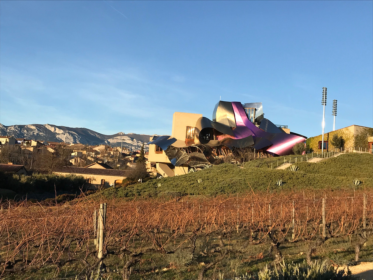 1시간 20분여를 달리자 우리 앞에 드디어 모습을 드러낸 프랭크 게리의 작품. 티타늄 강판으로 전체 외관을 뒤덮은 것이 스페인 북부 도시 빌바오Bilbao에 있는 그의 또 다른 작품 구겐하임Guggenheim 미술관을 떠올리게 하면서도 분명 다른 매력을 가졌다. 넘실거리는 초록빛 포도밭에 보라빛 와인 한 방울이 흐르는 듯한 그의 작품은 역시 프랭크 게리다 라는 말이 절로 나오게 만들었다.