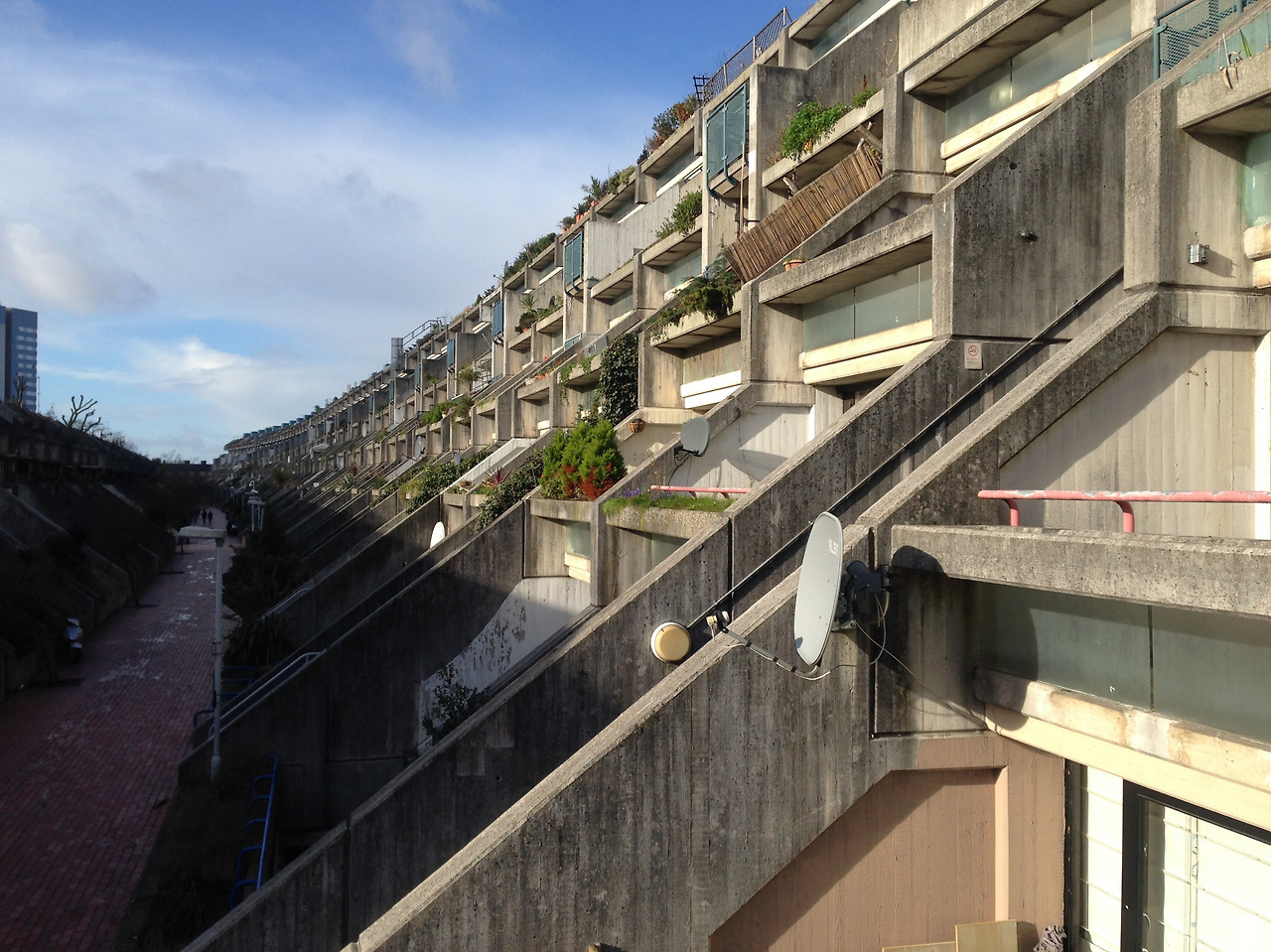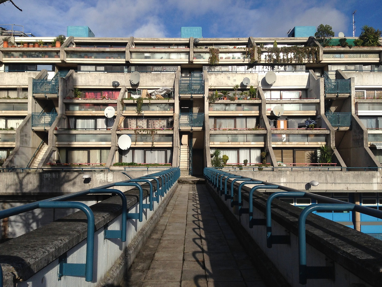 로리웨이는 기존에 도시의 조직을 구성하던 박공지붕과 갖가지 톤의 벽돌로 지어진 빅토리안 하우스의 장식적 요철을 배제한 채, 그와는 차별화된 브루탈리즘 건축양식과 모더니즘의 유토피아를 온몸으로 구현하는 느낌이다. 지금은 마치 폐허처럼 노출 콘크리트 표면에 검버섯이 얼룩져 있지만, 아마도 최초엔 매끈한 백색의 콘크리트 면이었으리라. 그때의 모습을 회상하는 누군가는 그리스의 하얀 집들을 떠올리기도 하고, 또 다른 누군가는 알카트라즈Alcatraz를 닮았다고 이야기하기도 한다.