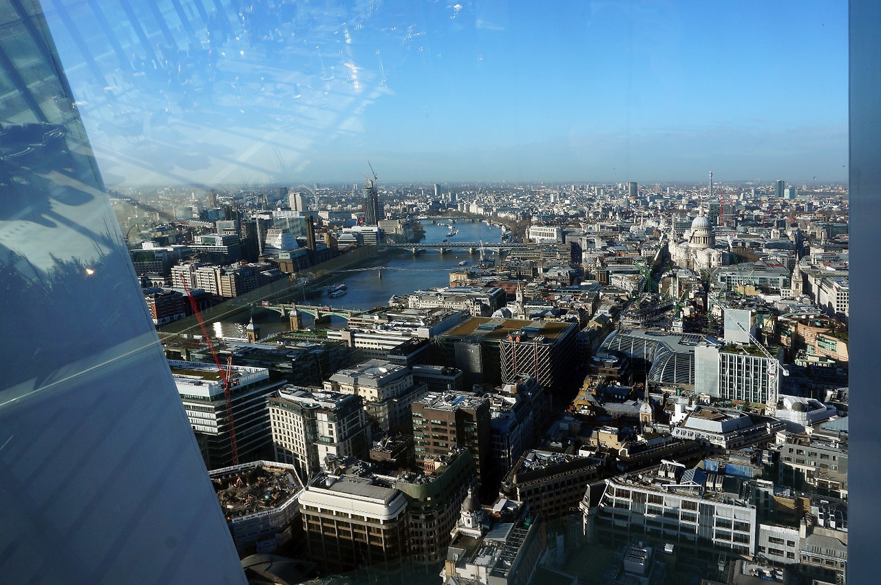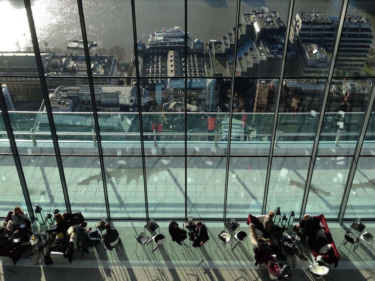 남쪽으로 들이치는 햇살에는 템스 강변을 따라 타워브리지와 런던브리지, 샤드의 풍경이 담기고, 동쪽으로는 멀리 카나리 워프Canary Wharf의 또 다른 마천루 군집이, 서쪽으로는 웅장한 세인트 폴 성당과 테이트 모던 미술관, 그리고 그 둘을 연결하는 밀레니엄 브리지와 다리를 건너는 사람들이 깨알같이 보인다.