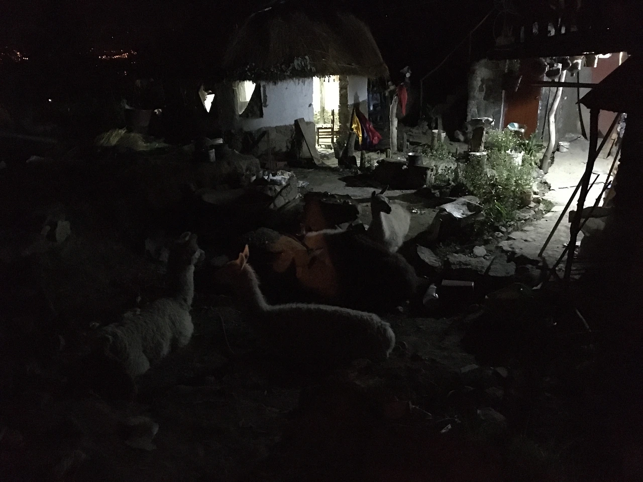 어둠 속에서 이쪽을 바라보는 네 마리의 네 발 달린 하얀 동물, 그것은 페루의 상징인 ‘라마’였다. 두 마리는 앉아서, 두 마리는 서서 이쪽을 보고 무언가를 질겅질겅 씹고 있었다. 별빛과 달빛, 그리고 라마의 빛으로 주위가 밝혀지는 것처럼 라마의 하얀 털은 어둠 속에서도 분명하게 보였다. 방으로 가려면 라마를 지나가야 했는데 우리가 가까이 가니 라마는 후다닥 뒷다리로 일어서 일정한 거리를 유지했다. 그러면서도 이 오밤중에 방문한 손님이 신기한지, 질겅질겅 입을 놀리며 계속 나를 쳐다보고 있다.