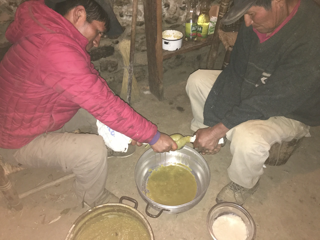 저녁을 먹고 어슬렁거리다가 내일의 제사를 본격적으로 준비하는 크리스티앙과 파파를 도왔다. 걸쭉한 액체를 면 보자기에 거르는 작업이다. 와츄마 혹은 이곳에서는 산 뻬드로라고 부르는 선인장을 완전히 두들겨 부수어 냄비에 저어가며 부글부글 끓인 후, 약간 삭히듯 시간을 들여 식힌 액체란다. 크리스티앙과 파파가 양쪽에서 보자기를 비틀고 내가 중간에 팔을 걷어붙이고 달려들어 짰다.