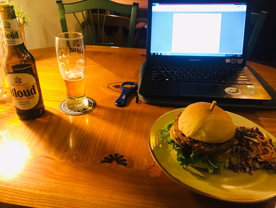바로 근처에 미리 봐둔 채식 식당, 앤드유 카페가 있어 저녁 식사는 그곳에서 하기로 했다. 최근 다시 채식 지향적인 삶을 위해 노력하고 있다. 호주 산불, 우리나라의 산불 등이 기후변화와 관련이 있다는 소식은 다시 채식 지향적인 삶을 살자고 마음먹게 했다. 앤드유 카페에서 얼마 전부터 먹고 싶던 베지버거를 주문했다. 한쪽에 며칠 전부터 못 쓰고 있던 글을 쓰기 위해 노트북을 펼치고, 맥주 한 잔과 버거를 먹었다. 직접 콩으로 만든 패티를 사용한다는데 담백한 맛이 일품이었다.