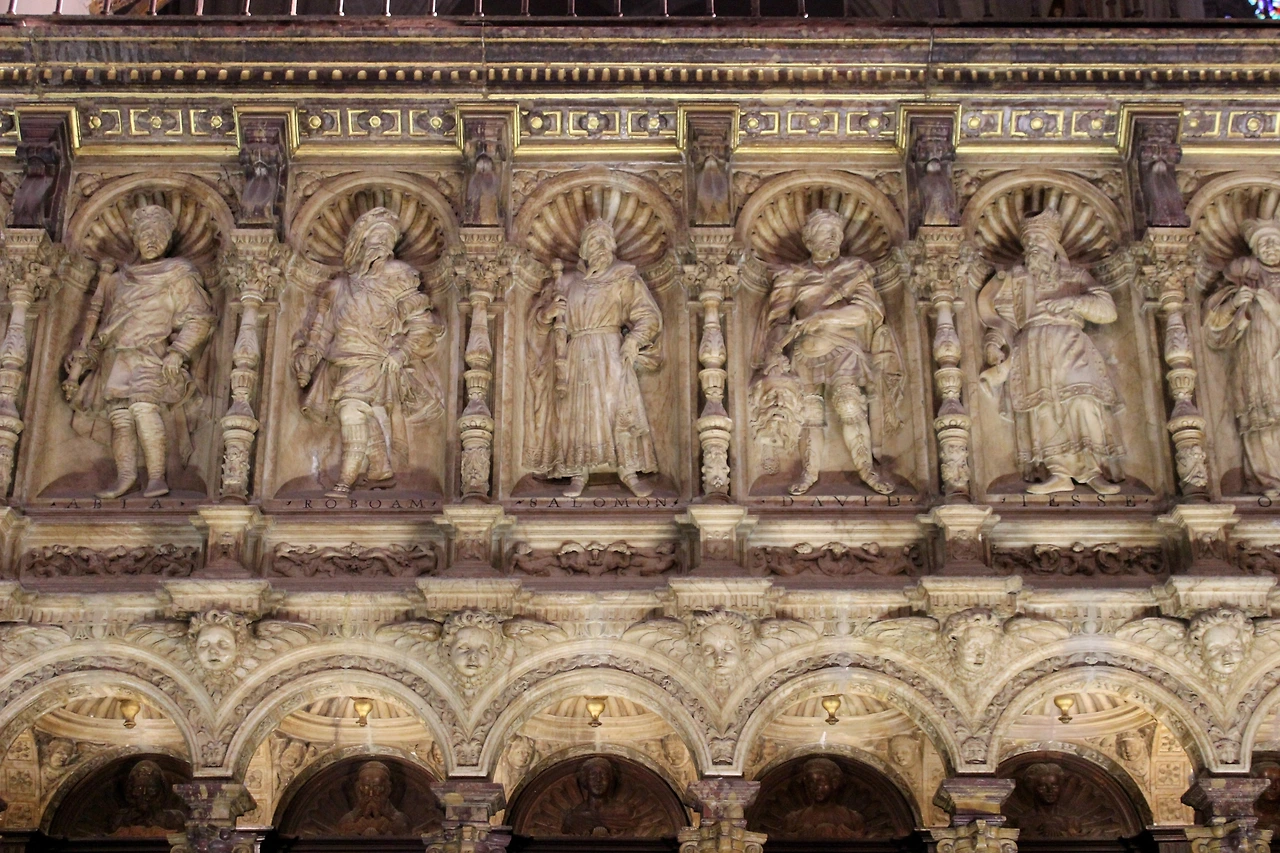 성가대원의 자리를 보면 수많은 부조가 새겨져 있다. 저 부조는 로드리고 알레만에 의해 조각되었는데, 재료로 쓰인 나무가 일명 ‘나무계의 망둥어’, ‘나무계의 고등어’라고 불리는 호두나무다. 카리브해산이라고 하는데, 잘만 조각하면 몇 백 년, 몇 천 년을 가지만, 결을 잘못 만지면 단번에 망가진다고 한다. 이 부조는 그라나다 레콩키스타의 마지막 장면을 묘사하는데, 순차적으로 나시리 왕조를 무너트리는 이세벨 여왕의 이야기를 그려내고 있다.