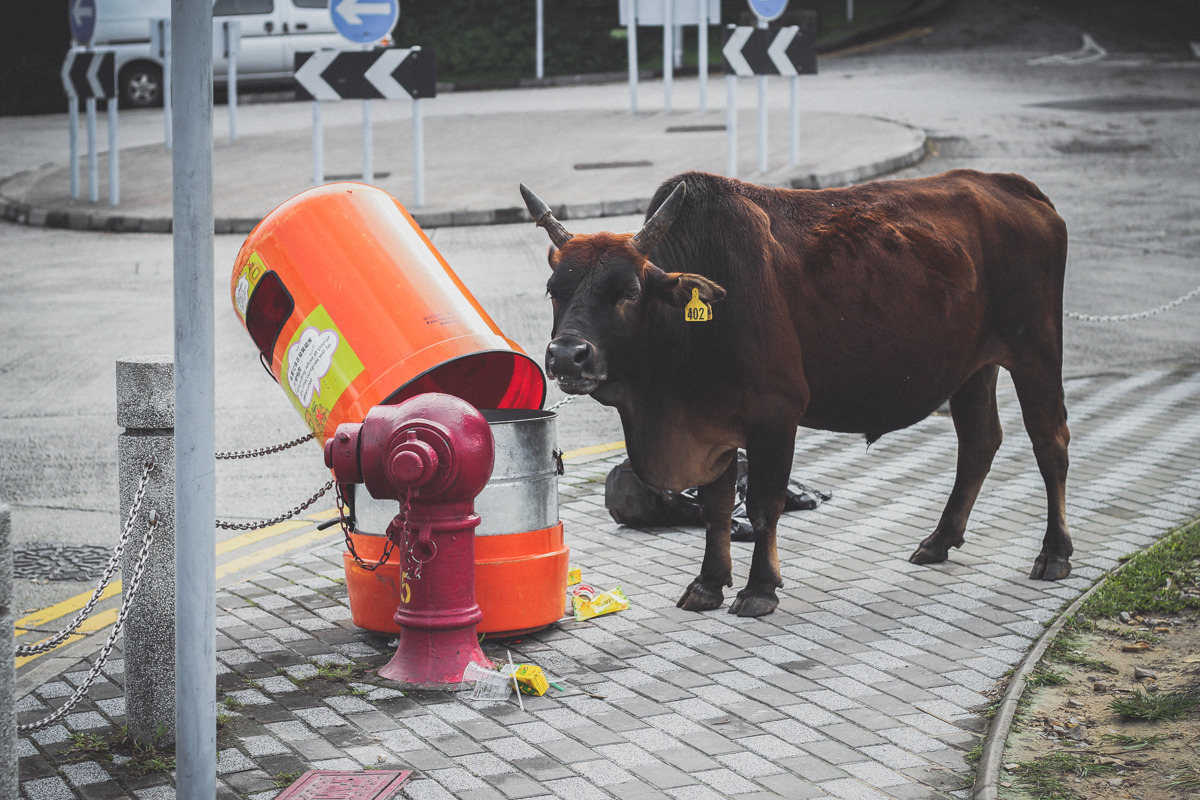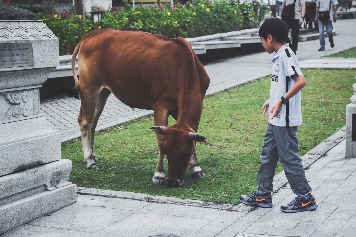 사원 앞 광장에 방목된 소만 보더라도 그랬다. 도심 한복판에서 "어, 소다."라고 말할 일이 얼마나 자주 있을진 모르겠지만, 그럴싸하게 꾸며진 테마파크 옆에서 그런 말을 할 기회도 그리 흔치는 않을 것이다. 그런데 여기선 그 말이 나왔다. 갈색 털에 윤기가 흐르는 소들이 지나다니는 행인일랑 아랑곳하지 않고 잔디를 뜯고 있었다. 소도 기르면서 잔디 관리도 하겠다는 일석이조의 계획인지 포린사와 옹핑 빌리지 일대에 평화로운 분위기를 덧씌우기 위해서인지 그 정확한 의도는 알 수 없었으나 어쨌든 예상을 넘어선 크기의 불상만큼 예상을 넘어선 캐릭터가 아닐 수 없었다. 소들은 대체로 온순했고, 폐를 끼친다고 해봤자 쓰레기통을 쓰러트리거나 사람이 먹고 있는 군것질거리를 달라고 조르는 정도에 불과했다. 문득 이 소들이 사원 소속인지 테마파크인 옹핑 빌리지 소속인지 궁금해졌는데, 아쉽게도 그건 검색으로도 알아낼 수가 없었다.