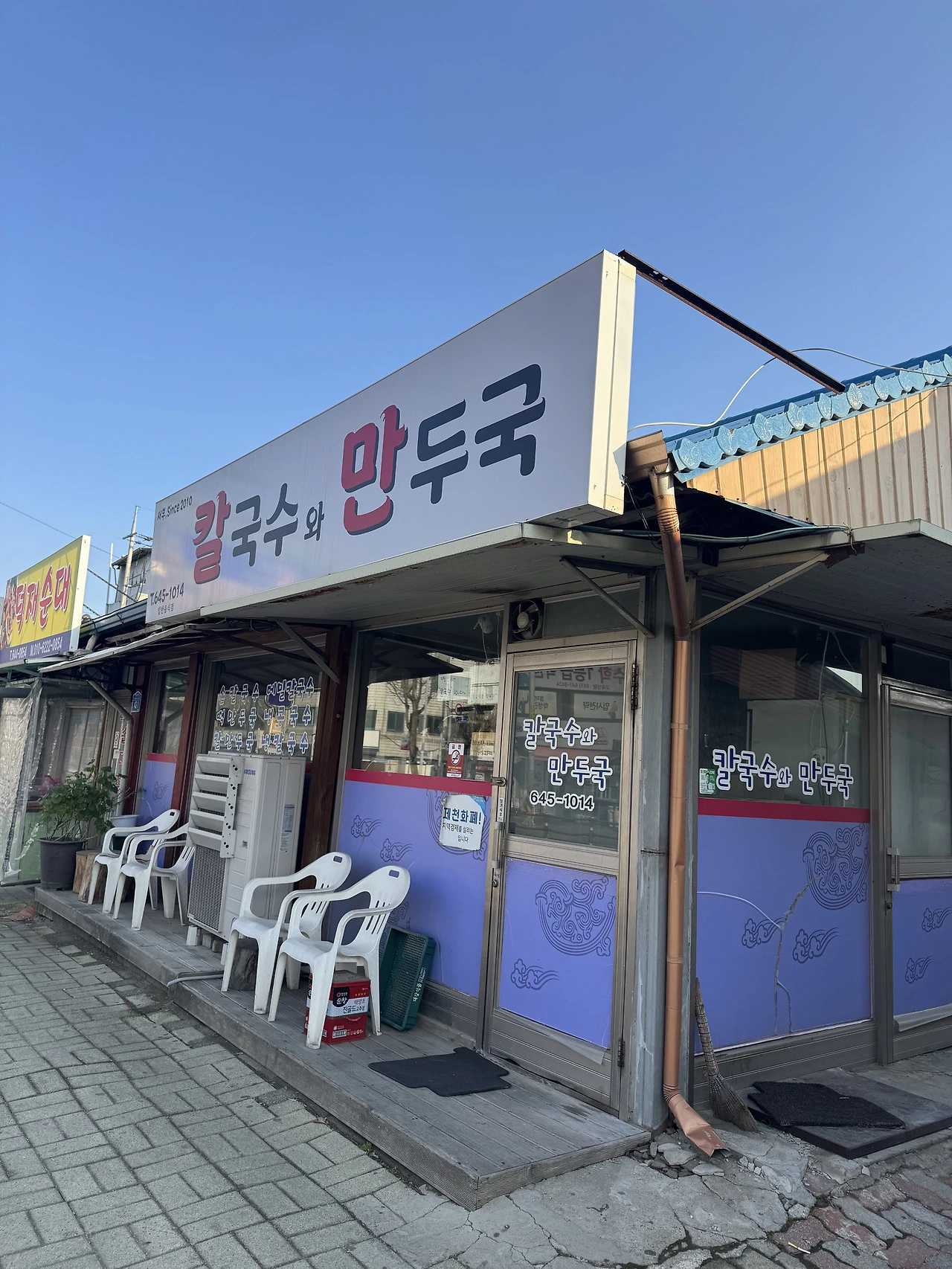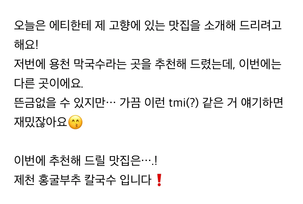 마지막은 가장 중요한 정보일 맛집이다. 도균이 언급한 맛집은 세 군데 정도가 있겠다. 모교인 제천중학교 바로 앞에 위치한 '칼국수와만두국', 제천시 내에서도 유명한 맛집인 '용천막국수', 그리고 최근 언급된 '홍굴부추칼국수'다. 필자는 만두를 좋아하기도 하고, 방문 당시 1인이었던 탓에 개인으로 방문할 만한 가게를 찾고 있었다. (참고로, ‘강원닭갈비수제막국수’는 2인부터 주문이 가능하다.)