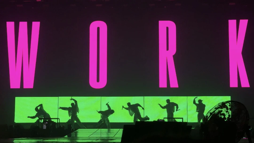 이어서 무드를 이어받은 것은 <Work>다. 이번 콘서트에서 연출로서 가장 화제를 이끈 무대가 아닐까 싶다. 이 곡은 멤버 종섭이 작곡•작사를 도맡은 곡으로, 필자의 이전 웹진인 <내가 쓰는 2025 K-POP 상반기 결산>에서도 소개한 바 있다. 그런 만큼 팬덤의 관심을 한 몸에 받고 있던 곡이자, 기대가 높았던 곡으로 연출에 있어서도 많은 부담이 있었으리라 예상한다. <Work>라는 곡의 특징은 단연 '건방짐'이다. (혹은 도도함?) 그리고 이를 공연으로 풀어내는 것은 결코 쉬운 일이 아니다. 피원하모니는 이것을 정면돌파하는 방식을 선택했다. 5km 밖에서도 SASSY할 것 같은 기호의 등장을 필두로 전 멤버가 인-아웃을 반복하며 무대의 중심을 주고 받는다. 이어지는 후렴에서는 약 20초 가량 모델 워킹을 선보인다. 런웨이의 기본인 포징도 빠지지 않는다. 청자가 <Work>라는 곡을 들으며 추상적으로 떠올린 형태를 퍼포먼스로 승화시킨 것이다. 새삼 이들의 담력에 감탄했다. 특히, 테오의 아이디어라는 엔딩 연출은 워크가 가지고 있는 프릭(freak)함을 시각화한 최고의 그림이었다.