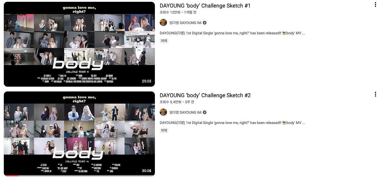 이 모든 노력은 솔로 활동에서 타이밍 좋게 빛을 발한다. 〈body〉 챌린지에 참여한 그의 선후배 및 동료는 장장 50여 명이다. 위 사진은 참여한 이들 한 명 한 명과의 비하인드를 담은 유튜브 영상 썸네일이다. 그가 여기저기 넉살 좋게 뛰어다니며 사귄 인맥을 한데 모으고 보니 그 규모에 입이 떡 벌어진다. 음악방송 PD들은 그를 위한 세트디자인에 발벗고 나섰다. 선배 에릭남은 다영의 미국행에서 해외 프로듀서진 컨택을 선뜻 도왔다. 얼마 전까지만 해도 다영의 생일축전을 깜빡할 정도로 시큰둥하던 회사는 그의 열정에 충격을 받고 전폭적으로 지원해주기로 했다. 별다른 프로모션을 하지 않은 것도 다영의 의견이라고. 팬덤은 그저 스타쉽이 홍보에 미진한 줄로만 알았지만 말이다.