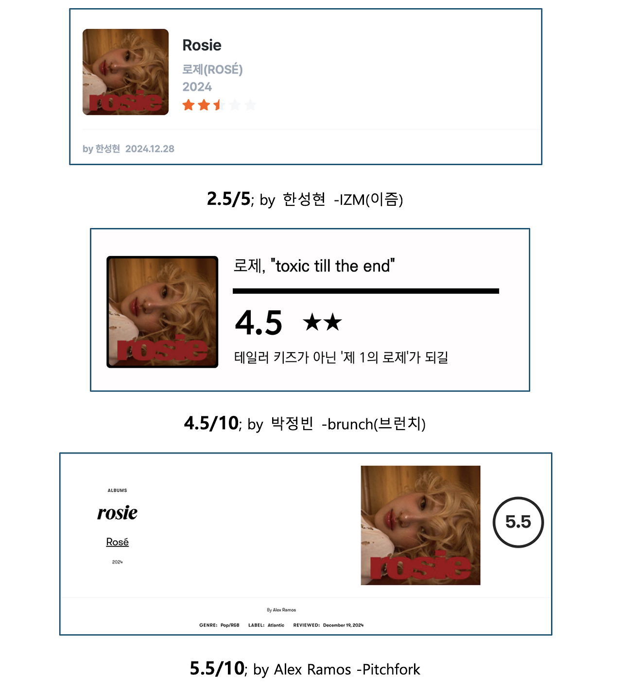 일단 위 스크린샷 속 별점은 5점 만점, 평론가는 3명이다. 로제의 솔로 앨범 《rosie》에는 2명이 2점, 1명이 3점을 주었다. 평론의 공통된 내용은 ‘앨범명은 《rosie》임에도 정작 내용물은 테일러의 것일 뿐이다’, ‘자기자신이 없다.’ 정도로 요약할 수 있겠다.