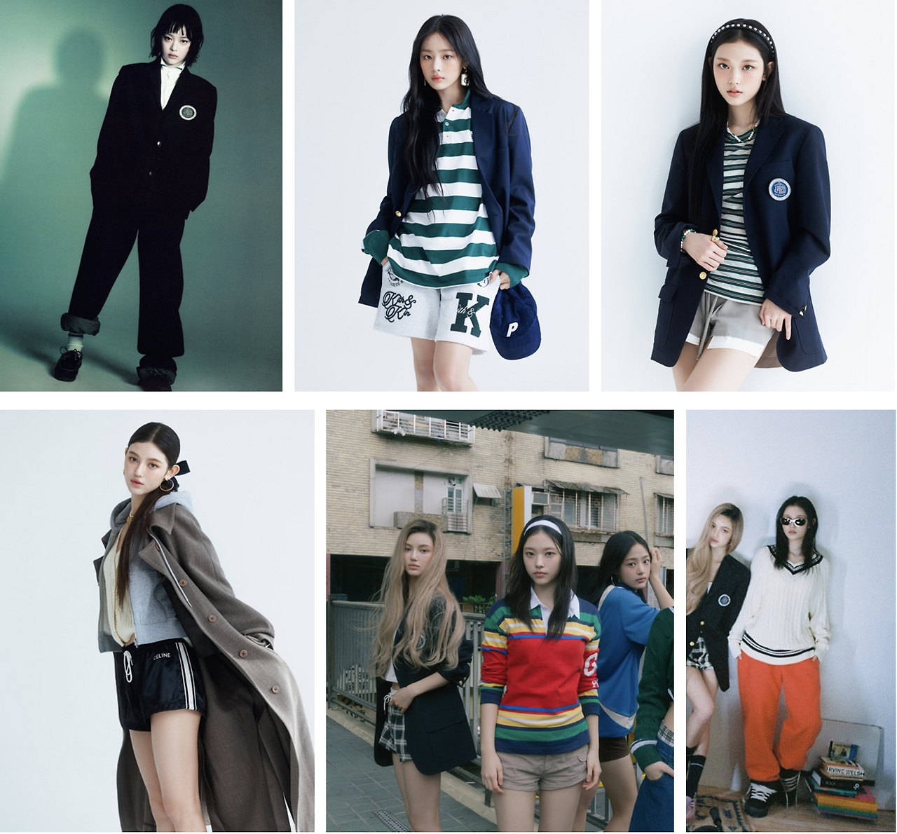 제이프레스(J.Press)X시오타(Ciota)의 콜라보 제품인 금장단추 네이비 블레이저에 매치한 각자 다른 캐주얼 아이템이 눈에 띈다. 차례대로 블레이저에 테이퍼드~스트레이트 핏 청바지를 롤업한 코디(하니), 키스(Kith)의 멜란지 질감 버뮤다 팬츠(민지), 베이지-화이트의 밴디드 레이어드 숏팬츠(해린), 셀린느(CELINÉ)의 돌핀팬츠와 체크 숏팬츠(다니엘)를 조합했다. 다섯 번째 사진에서 다니엘과 같이 있는 해린, 민지도 또다른 숏 기장의 아이템을 선보인다. 블레이저나 롱코트에 이런 식으로 짧은 기장의 일상복을 덧대 고전 복식 특유의 답답함을 환기하는 지점은 분명히 매우 신선한 부분이다. 프레피 룩을 새롭게(Neo) 확장하려는 시도는 이 뿐만이 아니다. 여섯 번째 사진 속 해린 역시 프레피 룩 이너로 자주 쓰이는 V넥의 크리켓(꽈배기) 니트를 단정하기보다 자유분방하게 연출했다. 아마도 본인의 정사이즈보다 한 치수 크게 입었을 니트가 좀 더 시원시원한 선을 만들고, 쨍한 버밀리온(주홍; vermilion) 색의 와이드 팬츠와 ERL 신상 보드화가 니트라는 아이템에 적당한 역동성을 부여한다.