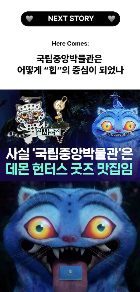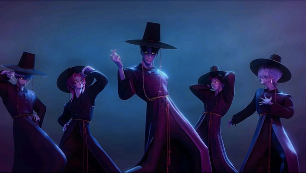 : 퇴마 아이돌이라는 컨셉은 '무당'을 현대적 어반 판타지 히어로로 재해석한 것입니다. 헌트릭스의 로고는 전통 '노리개' 매듭에서, 멤버 조이의 무기는 '신칼'에서 영감을 얻는 등, 한국의 전통 요소를 세련된 디자인 언어로 완벽하게 번역해냈습니다.