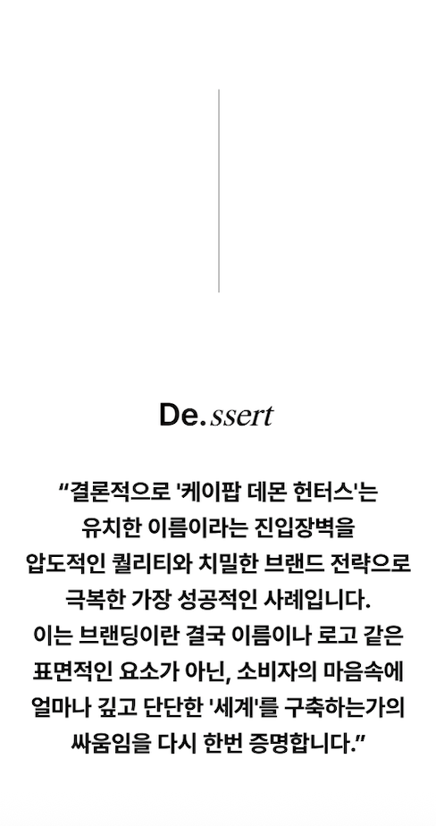 : "케이팝 데몬 헌터스"라는 직설적인 이름은, 역설적으로 양쪽 팬덤 모두에게 "왜 애니메이션/아이돌을 좋아하는지 알겠다"라는 반응을 이끌어내는 가장 효과적인 장치였습니다. 이는 '아이돌'과 '퇴마 판타지'라는 두 장르의 문법을 모두 충실히 따르겠다는 선언이었고, 결과적으로 두 팬덤 모두를 유입시키는 강력한 자석이 되었습니다.