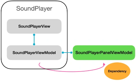 이제 생성된 뷰모델을 다음 화면인 패널 뷰에게 주입해주기만 하면 됩니다. 하지만 뷰모델이 직접 다음 화면의 뷰를 생성하고 관리할 수 없습니다. 뷰모델은 플랫폼과의 종속성이 끊어져 있기 때문입니다. 그렇기에 플레이어 뷰모델은 생성 및 바인딩까지 완료한 패널 뷰모델을 자신의 뷰에게 전달합니다. 뷰는 온전히 플랫폼에 종속되기 때문에 뷰를 생성하고 관리할 수 있습니다.
