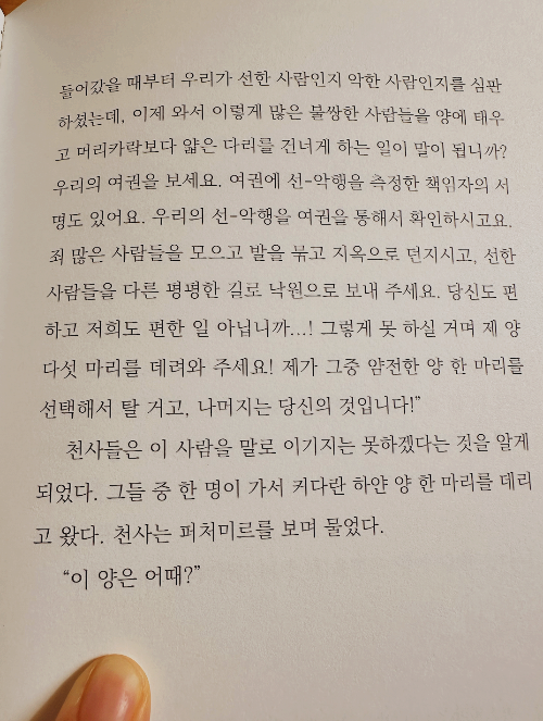 양을 데리고 와서 심판하는 장면이 있거든? 여기서 천사들이 불쌍한 사람들과 선악의 경계에 있는 사람들을 양으로 비유하면서, 그들의 운명을 결정하는 거야. "이 양은 어때?"라는 천사의 말처럼, 그 한 마리 양의 선택이 곧 그 사람의 구원이나 심판으로 이어지게 되지. 그런데 이 심판이 단순히 사람들의 죄를 따져보고 벌을 주는 것이 아니라, 어쩌면 그들을 더 억누르는 방식으로 작용한다는 게 소설의 핵심이야.