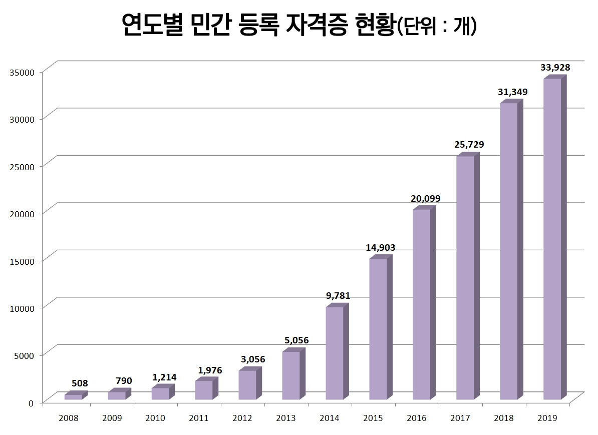 "자격증 수여는 그 학생의 기량, 능력, 지식에 대해 보다 유연하고 세분화된 증명이 될 수 있다."고 <평균의 종말>은 말한다. 여기서 한 가지 생각해볼 점이 있다. 우리나라는 '자격증 공화국'이라고 불릴 만큼 다양한 자격증이 존재한다. 국가자격증 160여 개와 민간자격증 3,400여 개를 합치면, 대한민국에 대략 3,560여 종의 자격증이 있다. 자격증을 발급할 수 있는 여건은 생각보다 쉽다. 한국직업능력개발원에 민간자격관리자를 신청하고, 결격사유가 없다면 자격증을 발급할 수 있는 자격이 주어진다. 자격증 자체가 수익창출에 이용되다 보니, 합격자가 많다는 뜻은 자격증 발급업체의 수익이 증가한다는 뜻이다.