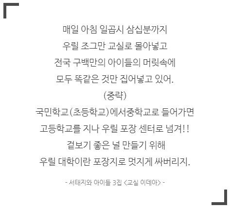 7080세대는 어렴풋이나마 공교육의 문제를 알고 있다. 유행가라고 흔히 부르는 노래 가삿말이 공교육을 비판하며 "됐어 됐어!!"를 외쳤고 "족해 족해!!"를 부르짖었다. 과거 BTS보다 더 큰 영향력을 끼쳤던 '서태지와 아이들'의 노래를 흥얼거렸던 그 세대는 기성세대가 되었다. 여기서 포장 센터, 포장지란 '낡은 프로이센 교육에 대한 반항'이다. 인간은 야외 채집 생활을 하며 성장했고, 농경사회에 이르러서 주거형태로 변했다. '농작물은 발소리를 들으며 큰다'라는 통론처럼 1년 365일 야외 체험학습을 했다. 할아버지와 아버지의 지식이 전부였고, 이를 전수받았다. 누군가는 농기구를 만들었고, 누군가는 옷을 만들었다. 과연 이들에게 학교가 필요했을까?