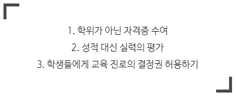이에 대한 해결책으로 토드 로즈는 '자격증'을 말한다. 지금 세대는 '안방에 가만히 앉아서 MIT나 하버드대학 강의를 들을 수 있는 시대'라 한다. 무크(MOOC | Massively Open Online Course)를 통해 유명 대학에 입학하지 않아도 세계 석학의 강좌를 들을 수 있다. 더욱 놀라운 것은, 권위 있는 대학교수의 온라인 수업을 무크(MOOC)를 통해 받고, 강좌를 이수한 모든 학생에게 자격증을 제공하고 있다. 무크의 자격증 수여가 파격적인 이유는 대학을 전면으로 부정하기 때문이다.
