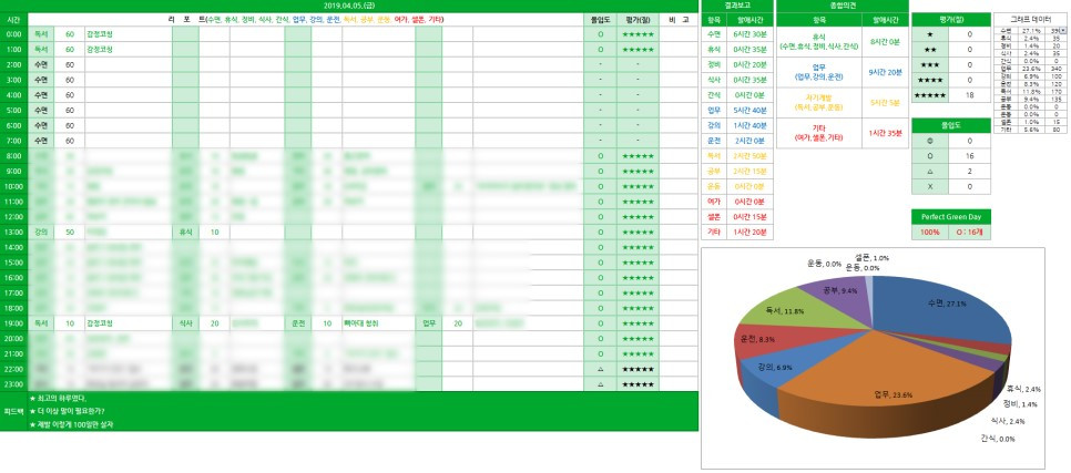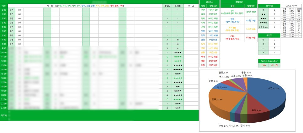 글쓴이는 2017년부터 데일리 리포트(DR)를 작성하고 있다. 데일리 리포트는 시간마다 자신이 한 일을 기록해서 과거를 반성하고, 성장하기 위해 작성합니다. 시중에 데일리 리포트를 위한 <폴라리스>가 있지만, 글쓴이와는 맞지 않아서 따로 작성하고 있다. 컴퓨터를 통해 작성하다 보니 하루 일과에 대한 데이터를 뽑을 수 있었고, 이를 객관화하여 점수로 표기했다. 평가하는 시스템은 간단하다. 우선 일과에 대한 항목을 나눈다. 글쓴이는 '수면, 휴식, 개인정비, 식사, 간식, 업무, 강의, 운전, 독서, 공부, 운동, 여가, 폰질, 기타'로 구분했다. 이것은 또다시 4개의 항목으로 압축할 수 있다. '수면, 휴식, 정비, 식사, 간식'은 [휴식]으로, '업무, 강의, 운전'은 [업무]로, '독서, 공부, 운동'은 [자기계발]로, '여가, 폰질, 기타'는 [기타]로 나눴다. 한 시간에 한 일에 대해 몰입도와 평가로 나눈다. 몰입도는 한 시간이 지나면 'A', 'B', 'C'로 평가하고, 최고의 몰입도를 느끼면 간혹 'S'라고도 표기한다. 데일리 리포트를 다 쓰고 하루를 마무리하며 평가했다. 꼭 해야 했던 일에는 별 5개(★★★★★), 해서는 안 될 짓(뻘짓)은 별 1개(★)로 구분했다. 이를 기준으로 '몰입도(A)와 평가(별 5개)'를 동시에 만족하면 +1.5점, 몰입도가 'C'랭크이면 -1.5점, 몰입도가 'S'면 +2점으로 계산했다.