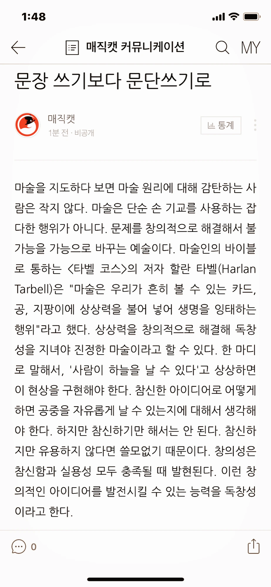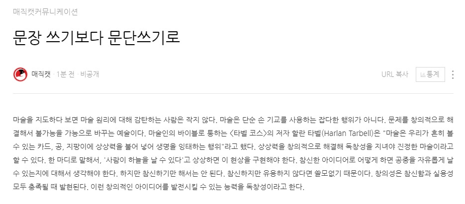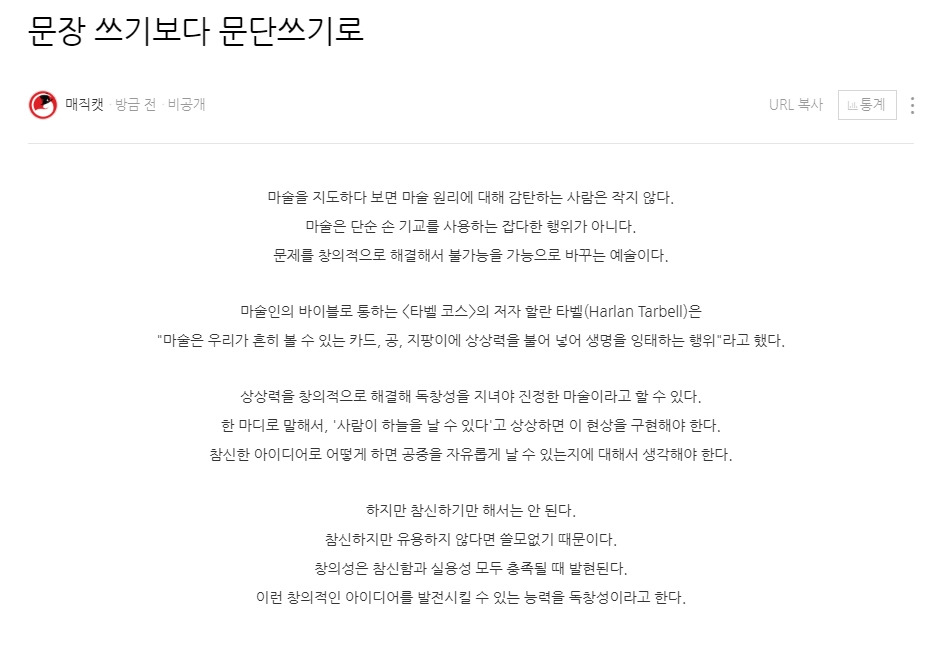 20세기 전, 글을 쓰는 사람은 특별한 대우와 존경을 받았다. 불과 20~30년 전만 해도 아무나 글을 유통할 수 없었다. 책으로 유통하면 상당한 비용이 들었다. 인터넷이 발명되면서 '글 쓰는 자격'이 없어졌다. 글 쓰고 유통하는데 비용이 거의 들지 않는다. 블로그, 티스토리, 브런치, SNS를 통해 자기 생각을 쓸 수 있는 시대다. 블로그를 통해 글을 쓰다 보면 딜레마에 빠진다. 글을 쓰는 사람은 컴퓨터로 쓰지만, 읽는 사람은 핸드폰으로 본다. 글을 이쁘게 꾸미기 위해 가운데 정렬로 '문장 쓰기'를 한다. 문장마다 줄을 바꾸며 읽기 편하다고 생각하지만 큰 오산이다.