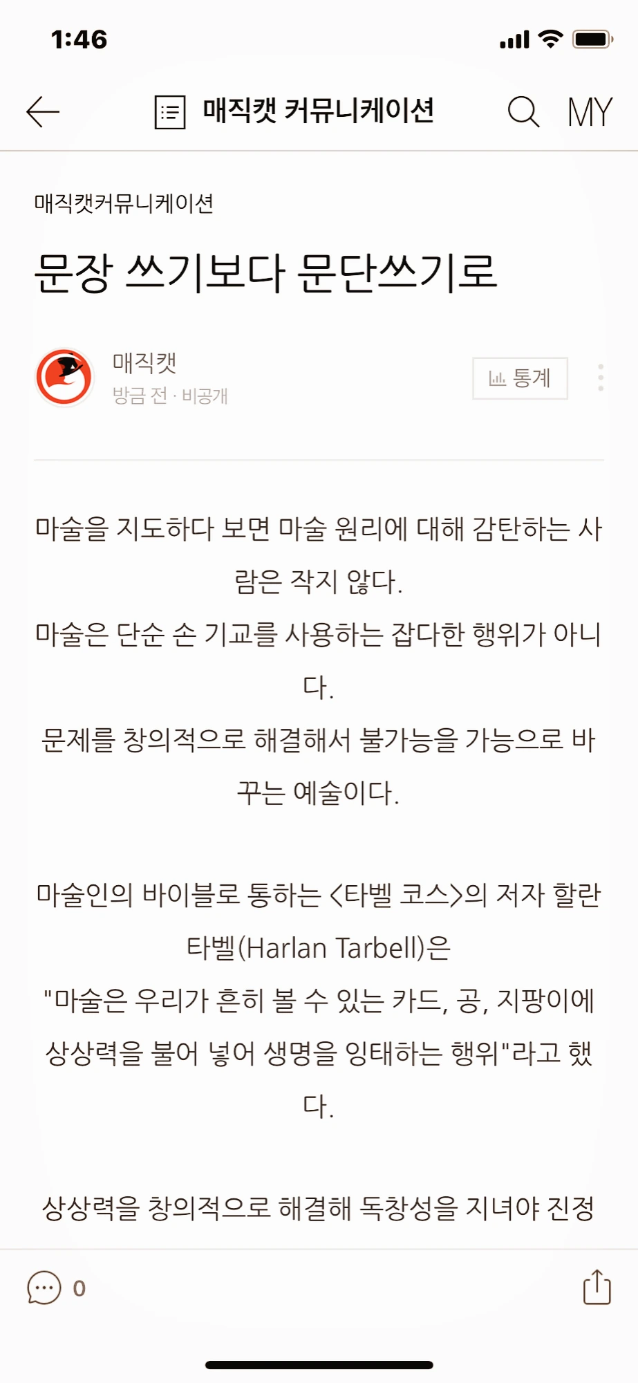 가운데 정렬로 '문장 쓰기'를 하면 컴퓨터에서는 깔끔하게 정렬되어 있다. 하지만 모바일로 보면 상당히 읽기 불편하게 보인다. 읽기 불편한 문장은 독자를 짜증 나게 한다. 이렇게 '문장 쓰기'를 하기보다 문장을 붙여 '문단 쓰기'를 하면 컴퓨터와 모바일에서 편하게 볼 수 있다.