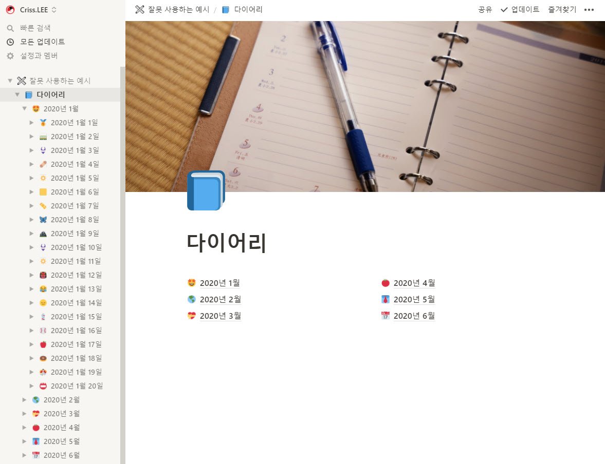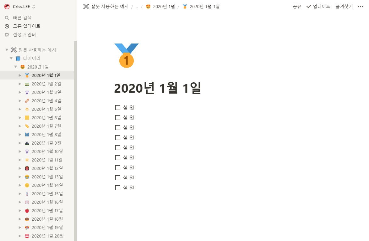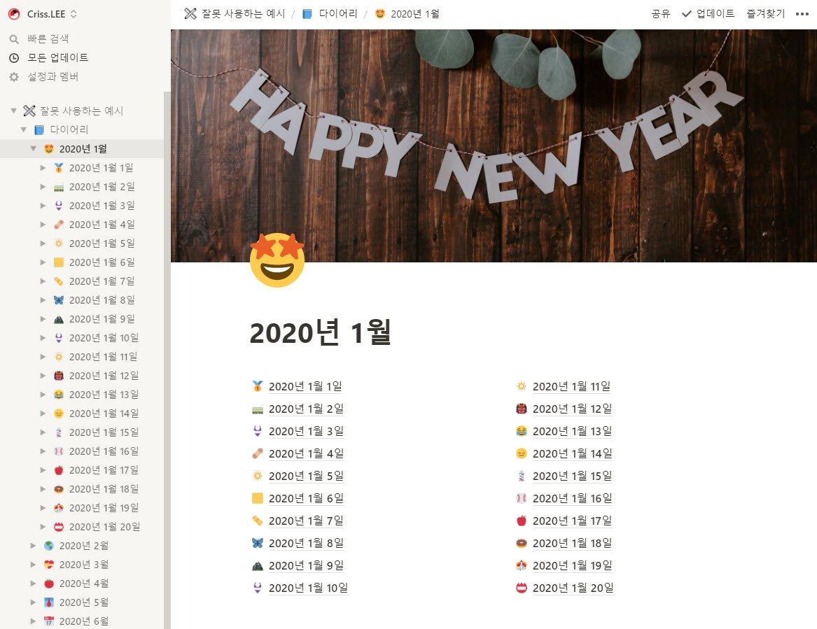제 노션을 보고 이런 생각은 말아주세요. 저는 2019년 처음 노션을 접했습니다. 주변에 얼리 어답터들이 "노션!! 노션~~!! 노셔으언!!!!!"을 외쳤기 때문에 노션을 사용하지 않으면 도태되는 분위기가 있었습니다. 하지만 왜 노션을 써야 하는지 피부로 와닿지 않았습니다. 아무리 많은 자료를 찾아봐도 노션을 메모앱 이상으로 활용하는 방법을 알려주는 사람이 없었기 때문입니다. 위에 보여드린 잘못된 예시처럼 사용하면서 노션을 극찬하고 있었습니다. 제 스스로 노션을 사용해야 한다는 설득이 안 되었던 거죠. 그래도 사막에서 벗어나기 위기 꾸역꾸역 걸어갔습니다. 1년 동안 사용하며 2번이나 눈물을 머금고 노션의 모든 자료를 포맷했습니다. 노션을 노션답게 사용하지 않아서 생긴 결과였습니다.
