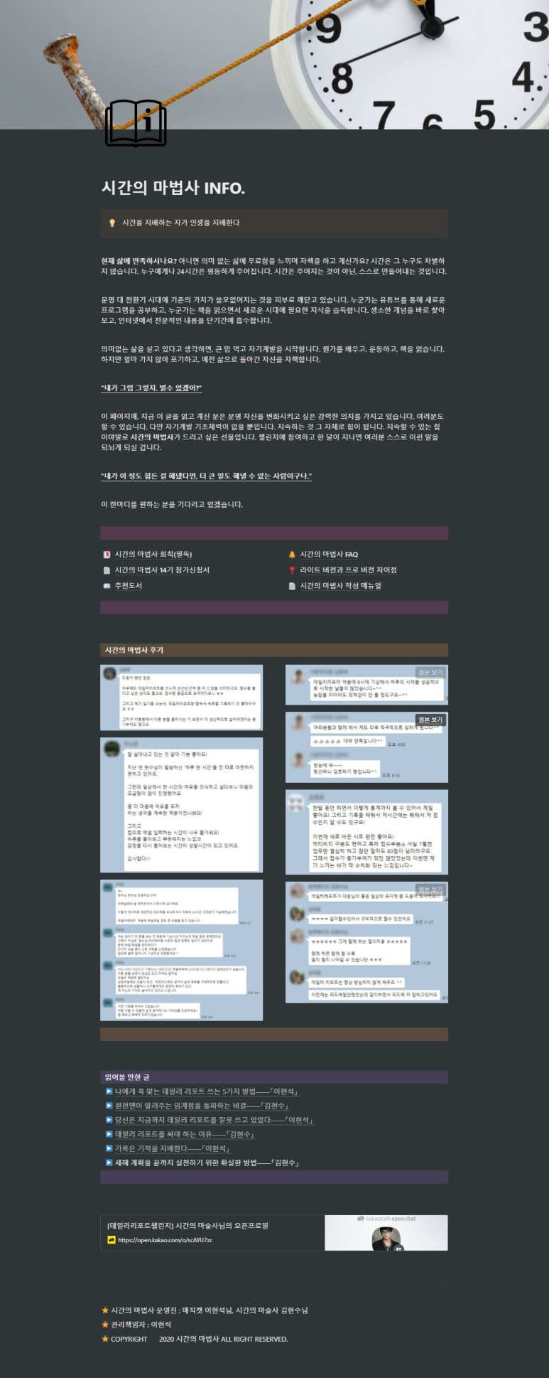 웹 사이트를 편하게 뚝딱~ 만들 수 있다는 점은 노션의 큰 장점입니다. 저는 시간의 마법사라는 데일리 리포트 챌린지를 운영하고 있습니다. 홈페이지가 완성되기 전까지 노션으로 제작한 웹 사이트를 사용했습니다.