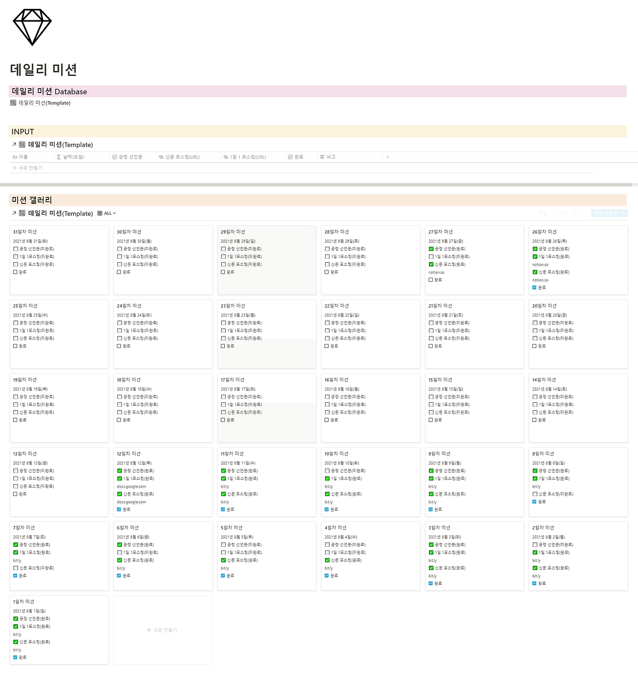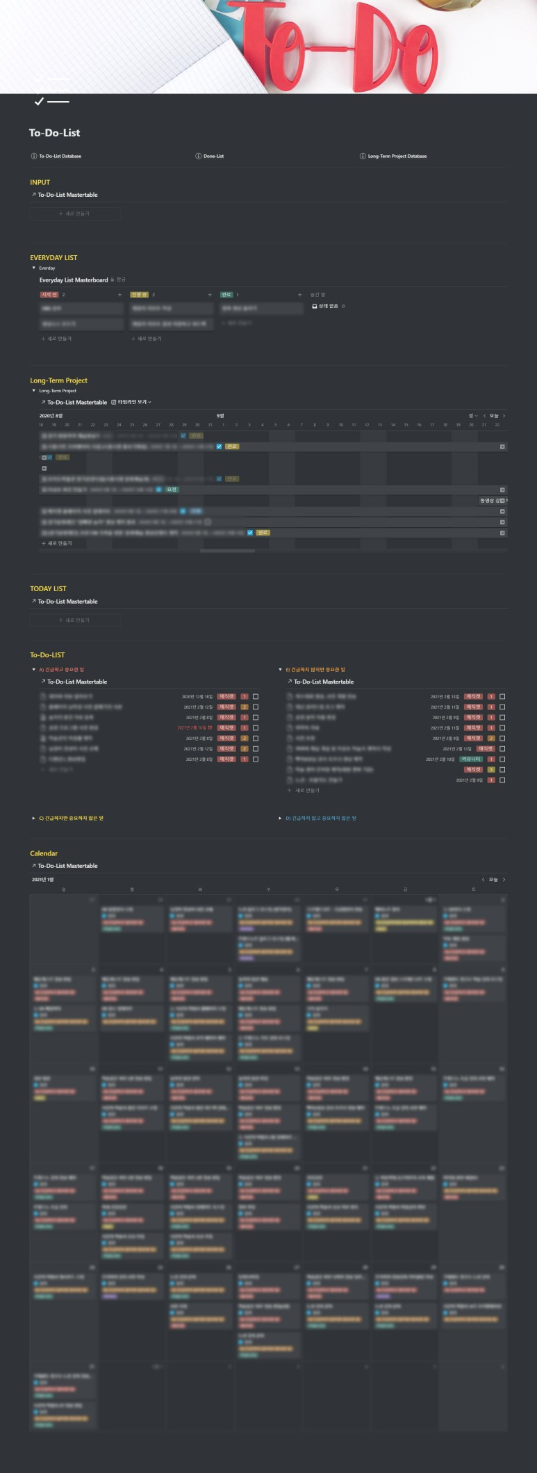 우리는 항상 시간이 부족하다는 핑계를 댑니다. 체계적으로 하루 일과를 정리하고 하루를 보내는 것과 무계획으로 하루를 보내는 건 상당한 차이가 있습니다. 목적지가 없는 사공에게는 그 어떤 바람도 순풍이 아닙니다. 하루에 무엇을 할지 우선순위를 정하고 체계적으로 하루를 보내기 위한 노션 비서입니다.