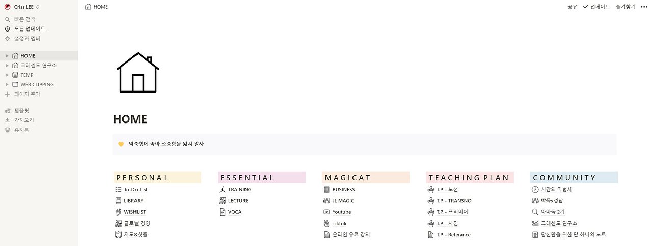 노션은 최대한 깔끔하고 직관적이고 편하게 사용해야 합니다. 사이드바에 페이지는 4개밖에 없습니다. 바탕화면 형태로 페이지를 구성하고 개인(Personal), 중요한 일(Essential), 업무(Magicat), 강의 계획(Teaching Plan), 커뮤니티 관리(Community)가 주요 목록입니다.