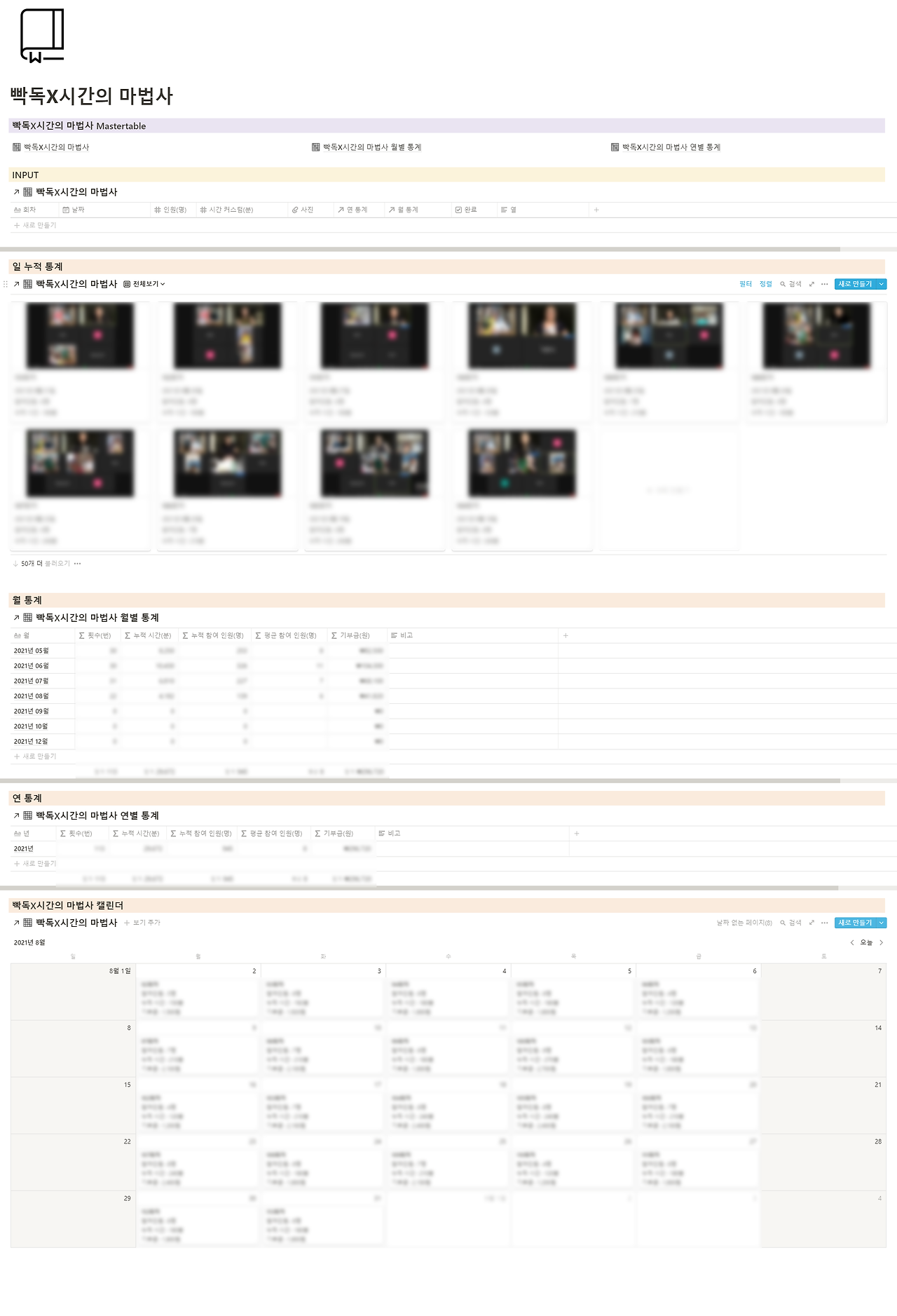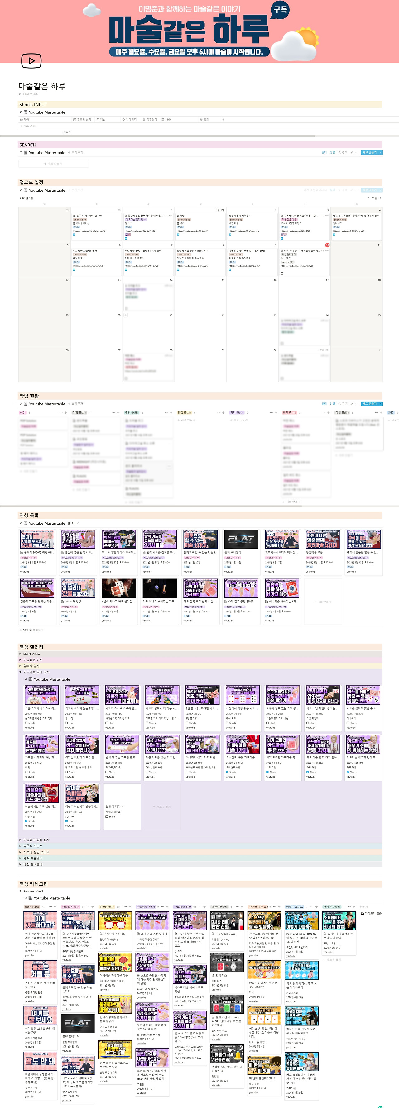 저의 직업은 마술사입니다. 유튜브에 '마술같은 하루' 채널을 운영 중에 있습니다. 처음 유튜브를 시작하면 영상이 몇 개 되지 않기 때문에 컴퓨터 폴더나 유튜브 스튜디오를 통해 관리가 가능합니다. 콘텐츠가 몇 백개 이상 되고, 카테고리가 많아지면 영상 관리가 점점 힘들어집니다. 유튜브 업로드 일정과, 어떤 영상이 올라갔는지 확인할 수 있는 페이지입니다.