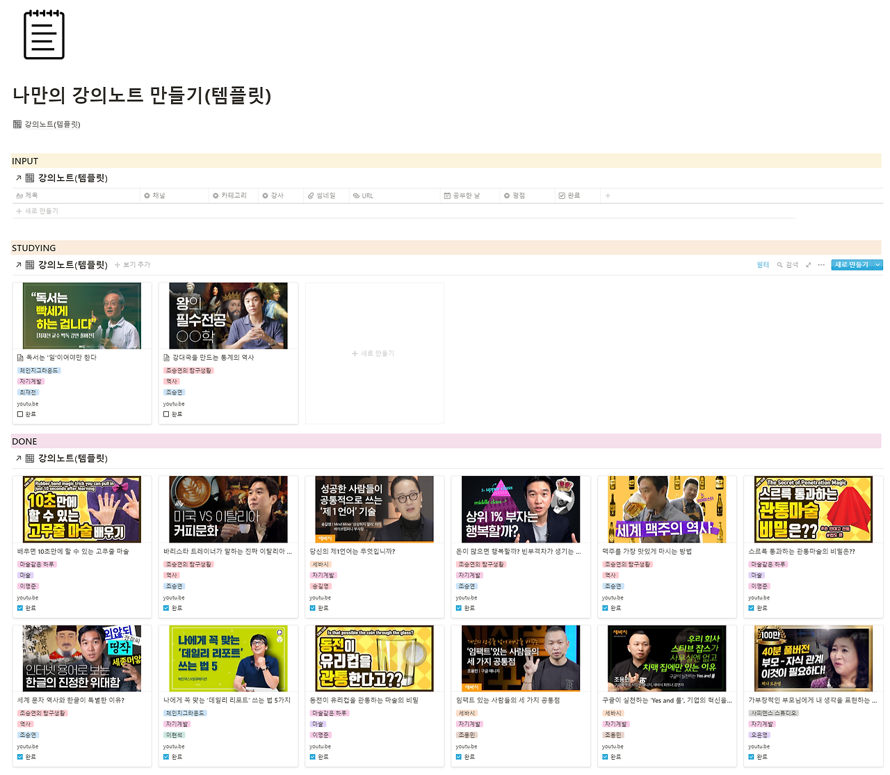 요즘 온라인에서 진행되는 수업을 많이 듣게 되는 시기네요. 유튜브에 좋은 채널에서 올라오는 강의를 정리하는 페이지입니다.